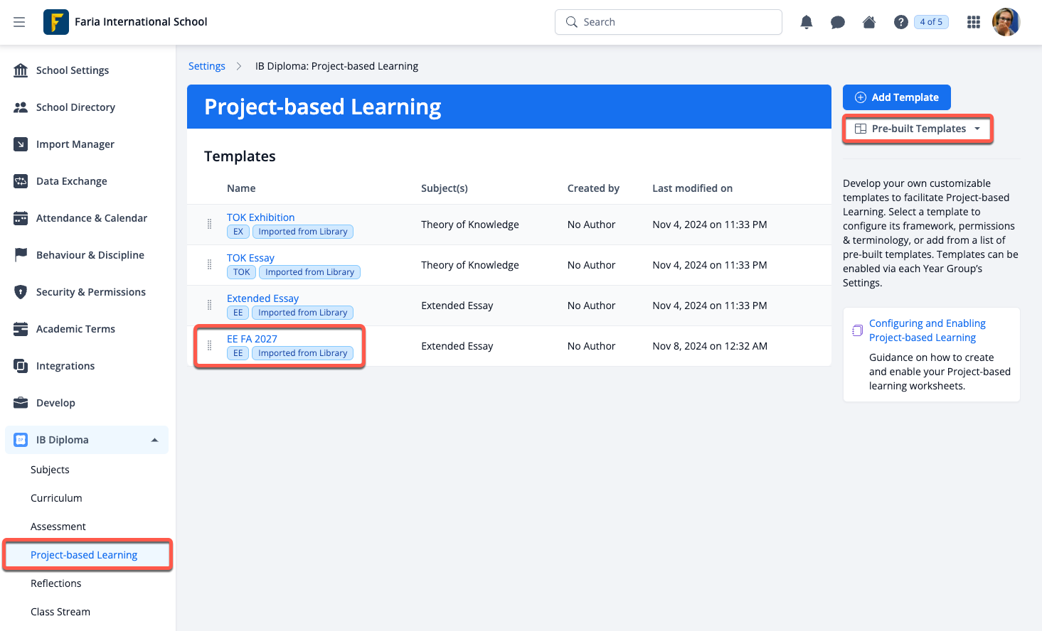Schools can now activate the IB DP Extended Essay project-based learning template for first assessment 2027 of Extended Essay that we added to all Settings > IB DP > Project-based Learning roster pages.