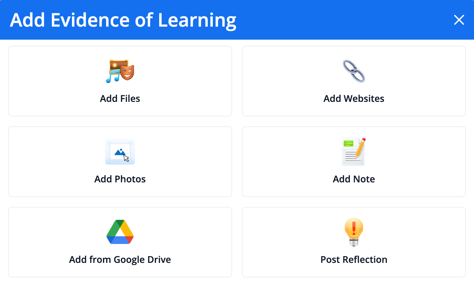 The process for adding Evidence of Learning has been simplified to support younger students better and reduce the burden on teachers. The modal for adding Evidence of learning includes large, user-friendly buttons for easier navigation, especially for primary-year learners.