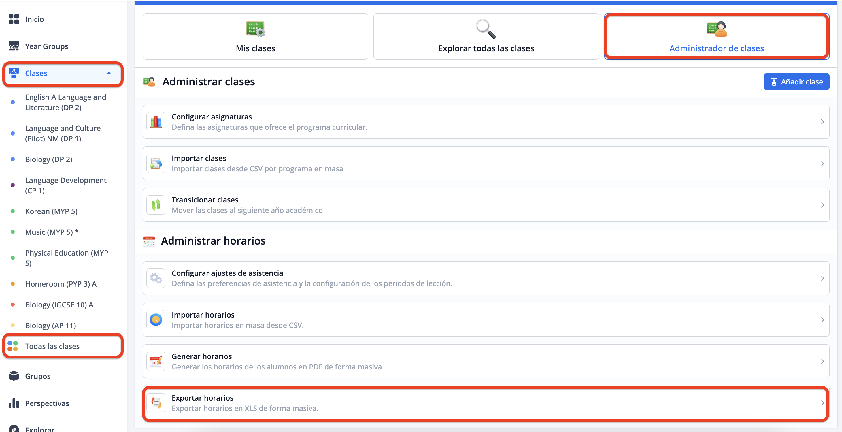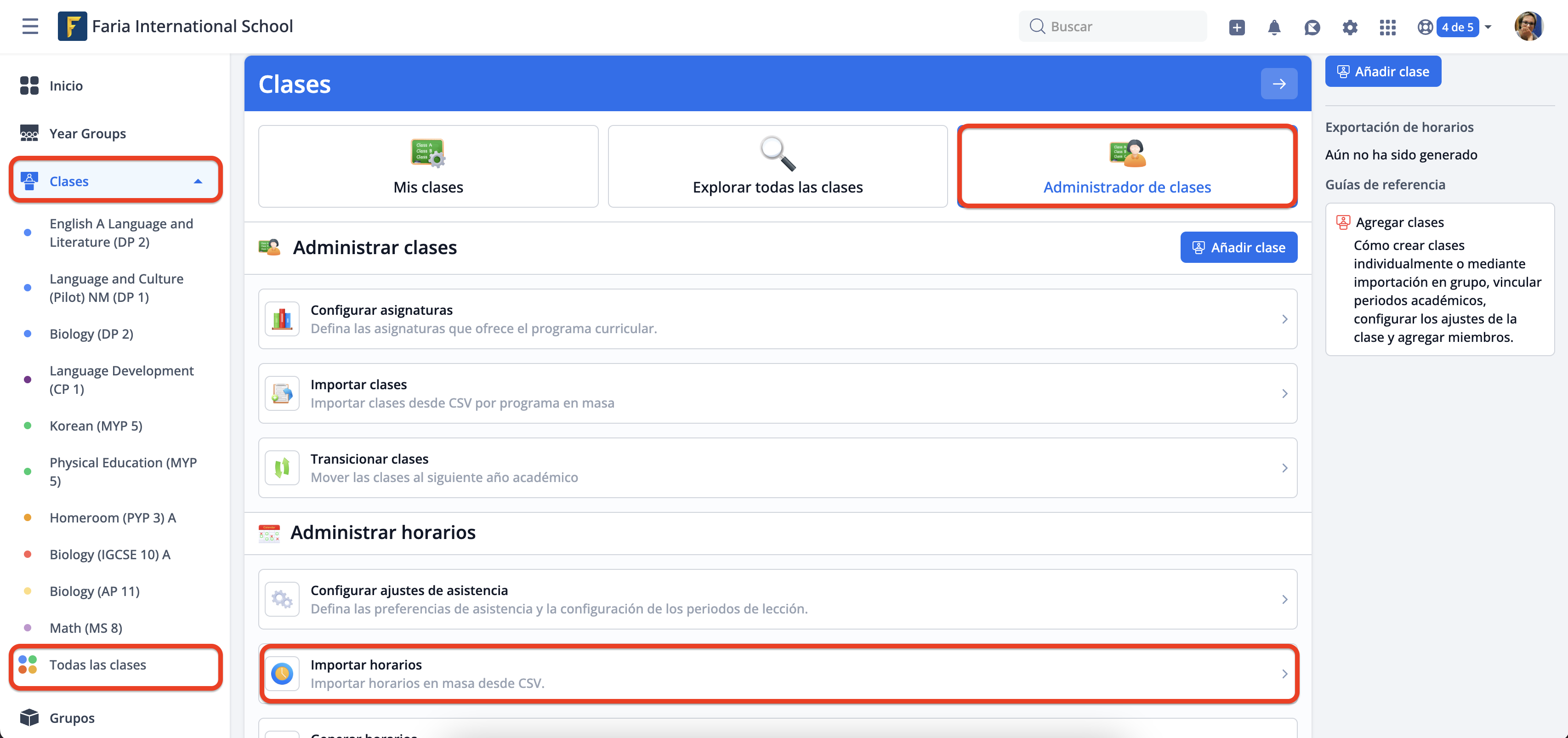 Importante: las clases deben estar creadas, después los horarios de clase deberán ser configurados para esas clases.
