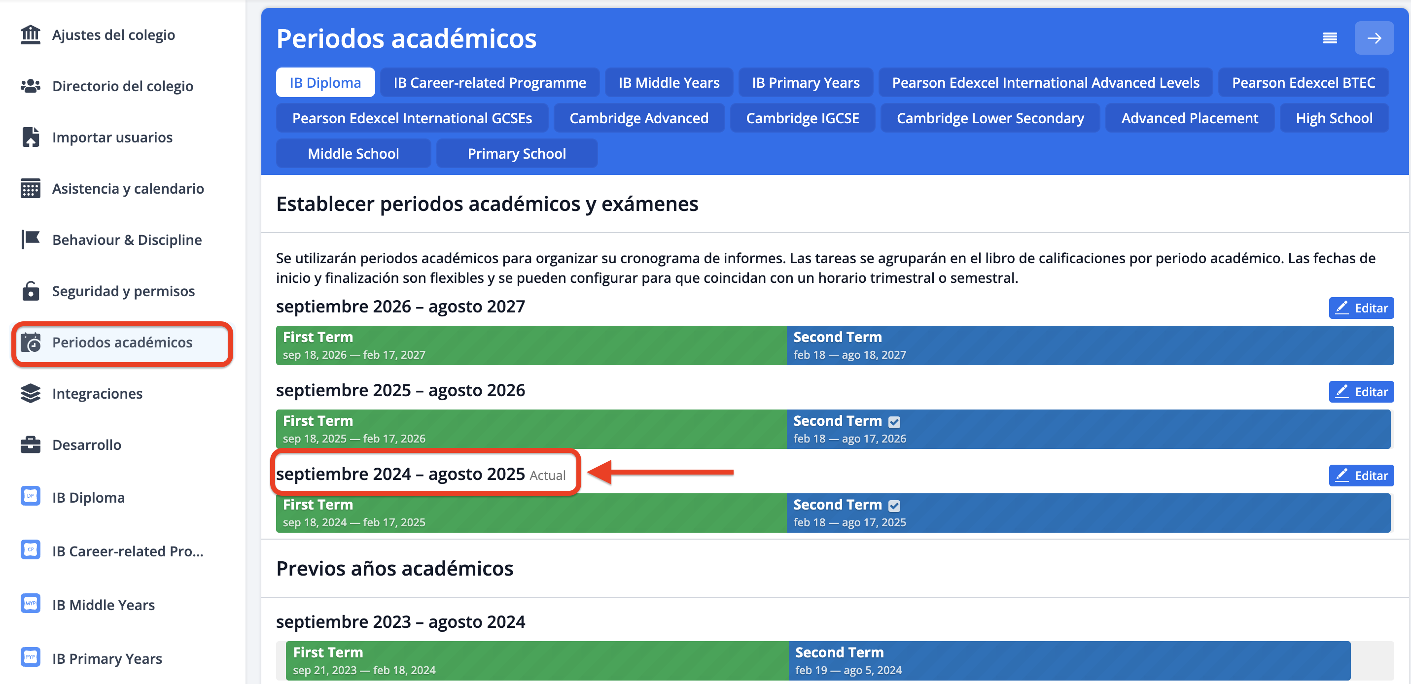 Es importante confirmar que un guión normal o el símbolo menos es utilizado, si tu ordenador actualiza esto a una guión largo cuando presionas la tecla de espacio, revierte el cambio. También puedes copiar y pegar el listado de Año Académico desde la página de Ajustes > Periodos Académicos para prevenir cualquier error en el formato.
