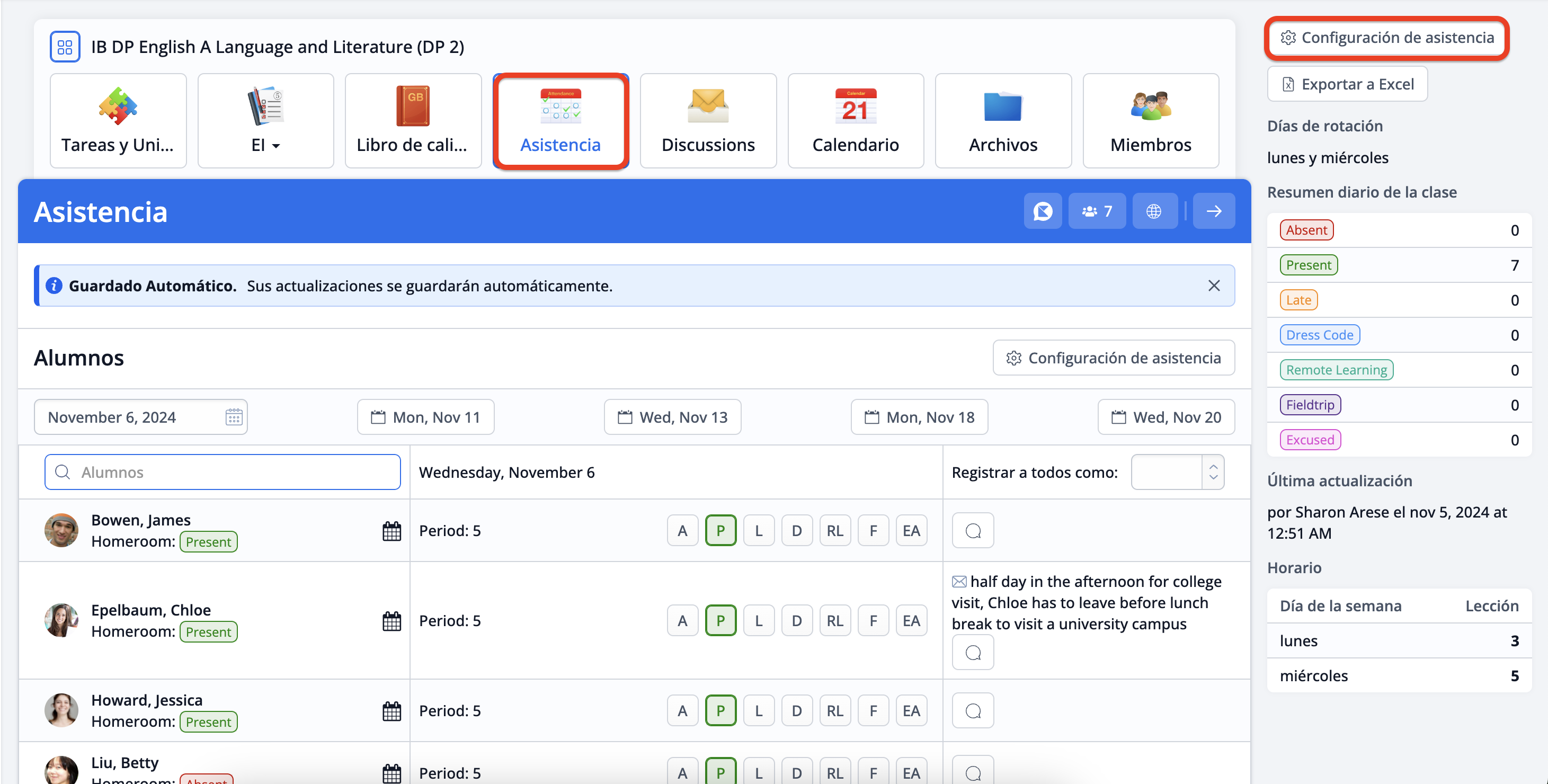 Los horarios de clase también pueden ser configurados manualmente, clase por clase. Para ésto, navega a cada clase hasta la pestaña de Asistencia y pulsa Configuración de Asistencia (en caso de que haya un horario existente que necesite ser configurado).