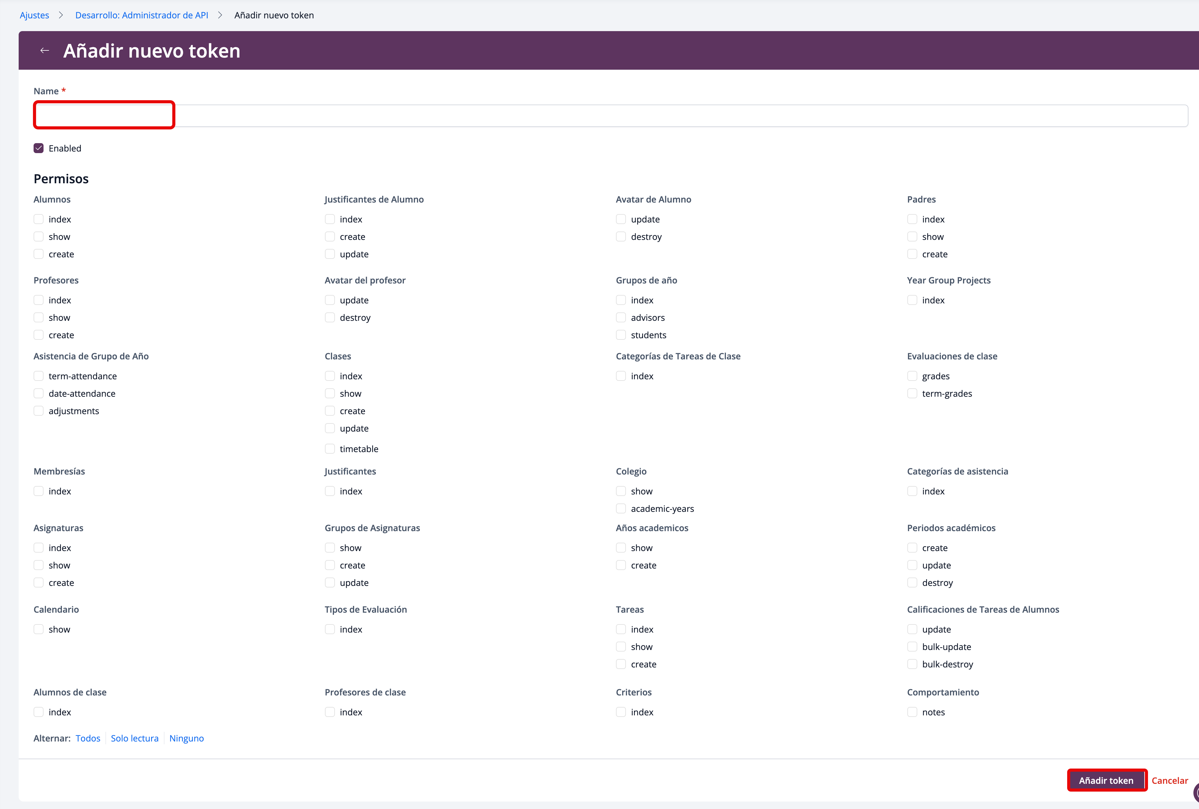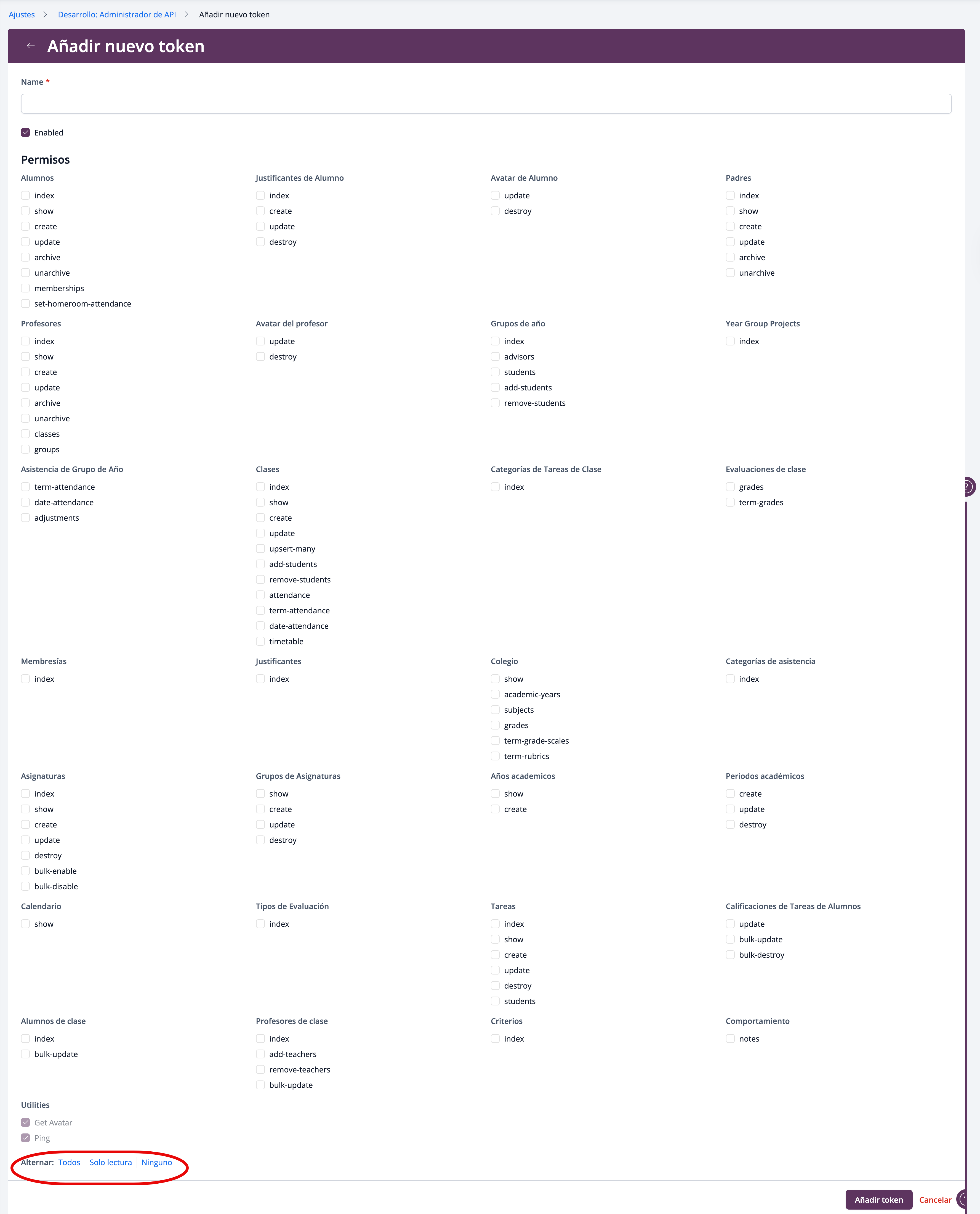 Desde esta pantalla, puedes seleccionar los permisos que deseas habilitar, incluyendo acceso a datos de alumnos, padres, profesores, grupos de año, clases, asignaturas, tareas, evaluaciones, asistencia y ajustes del colegio, entre otros.