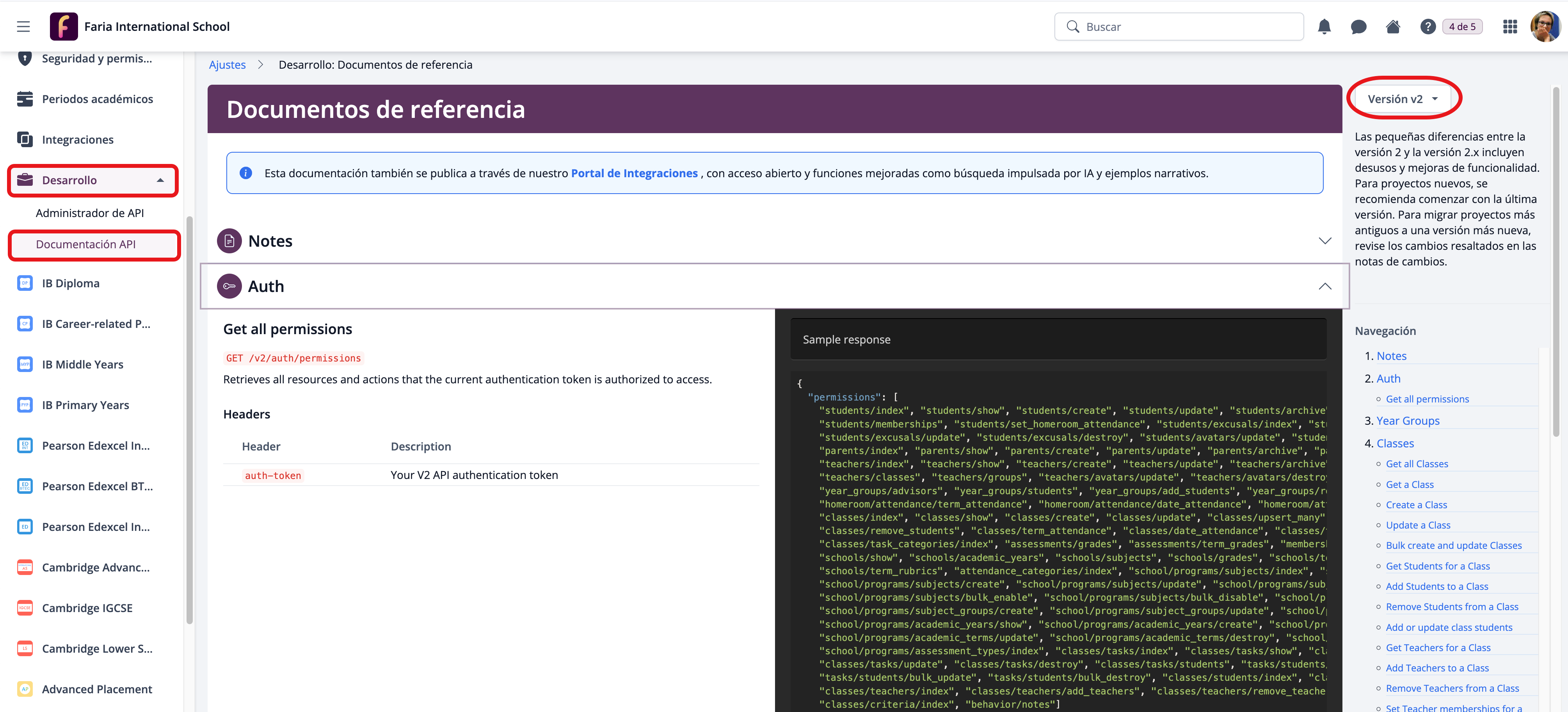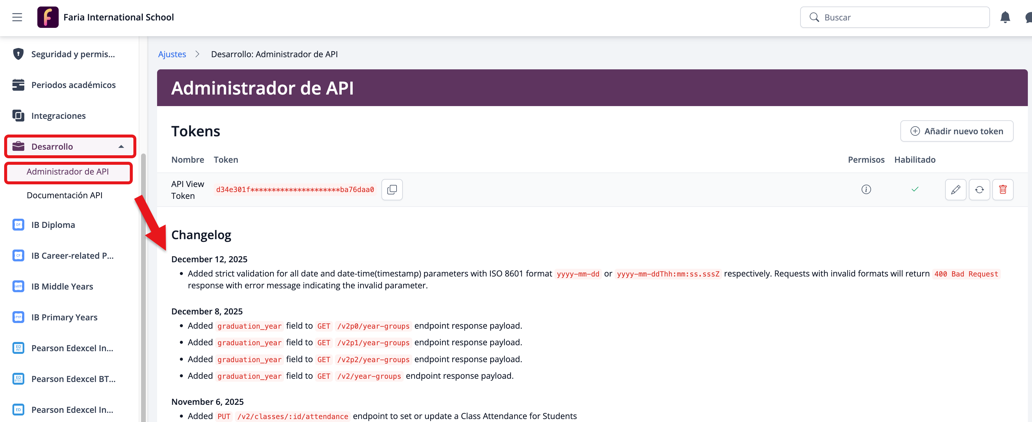 Puedes consultar los registros de cambios (Changelog) de la API de ManageBac desde Ajustes > Desarrollo > Administrador de API.
