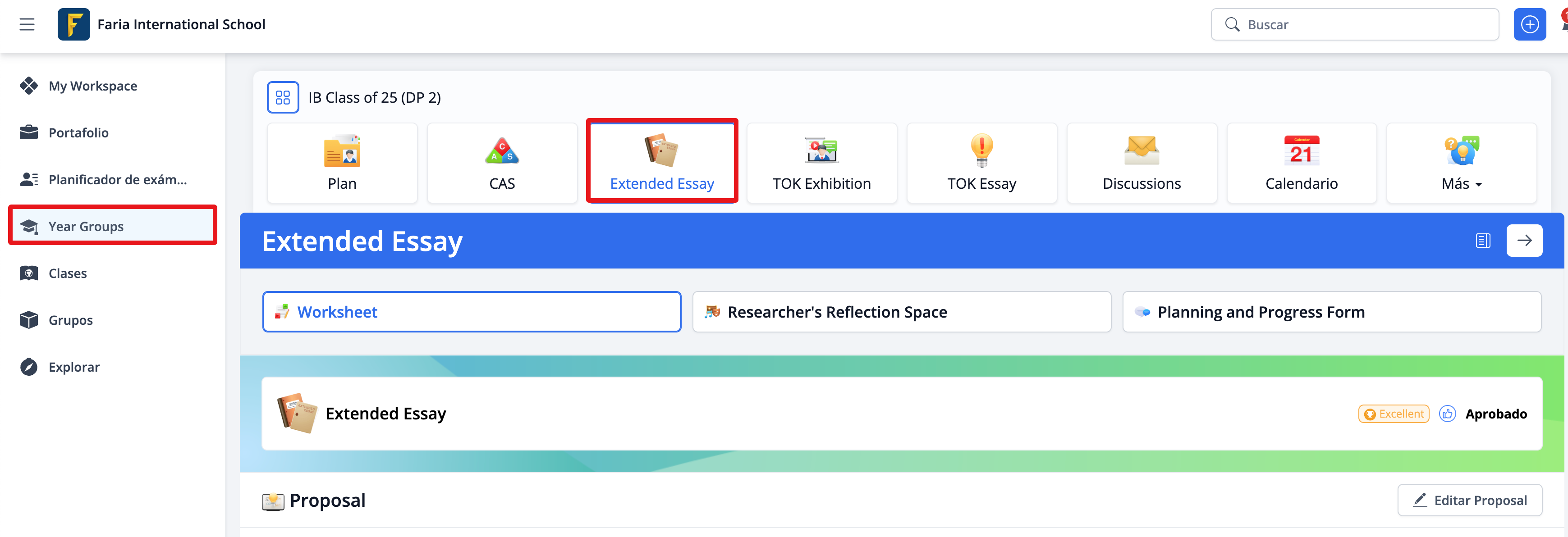 Navega a la sección Grupos por año en el menú lateral izquierdo y haz clic en Extended Essay.