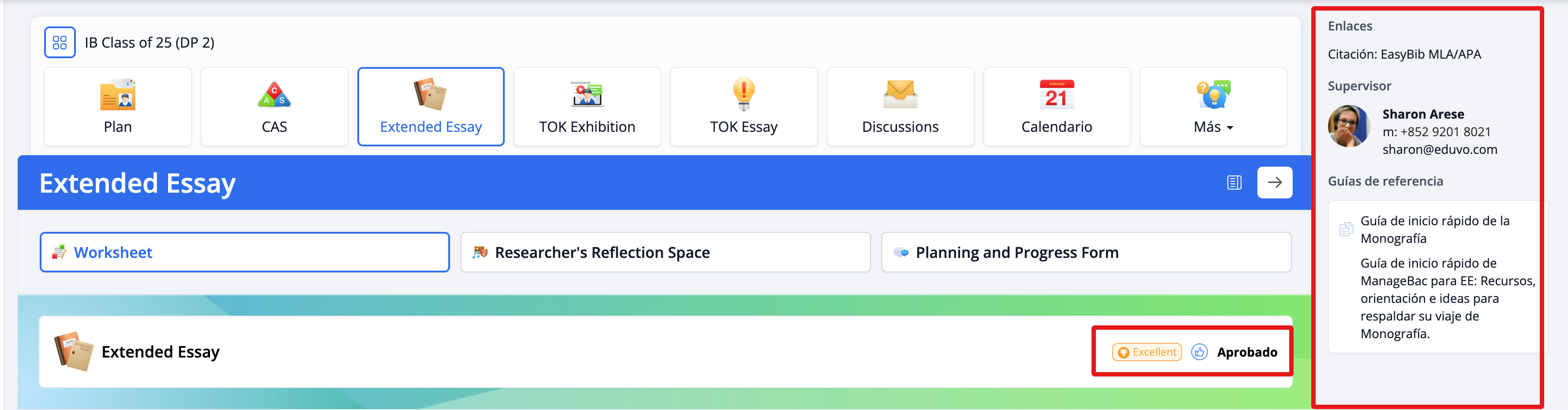 En el lado derecho de tu hoja de trabajo encontrarás una variedad de detalles que te ayudarán a dar seguimiento a tu Extended Essay.