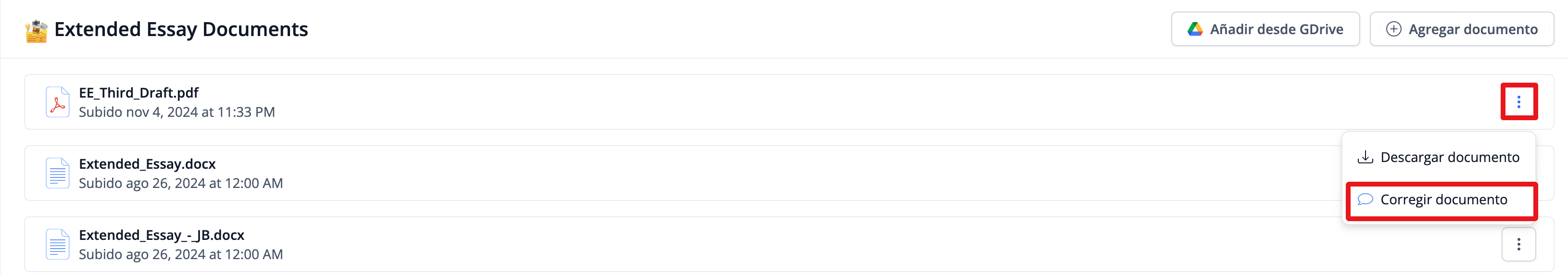 Los documentos subidos pueden ser anotados tanto por ti como por tu supervisor a través del ícono de tres puntos > Corregir documento.