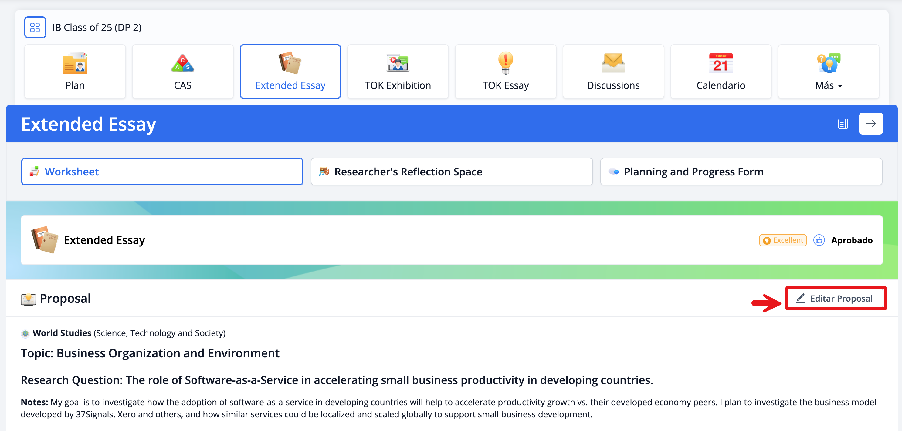 Puedes comenzar a trabajar en tu Extended Essay haciendo clic en Editar propuesta.