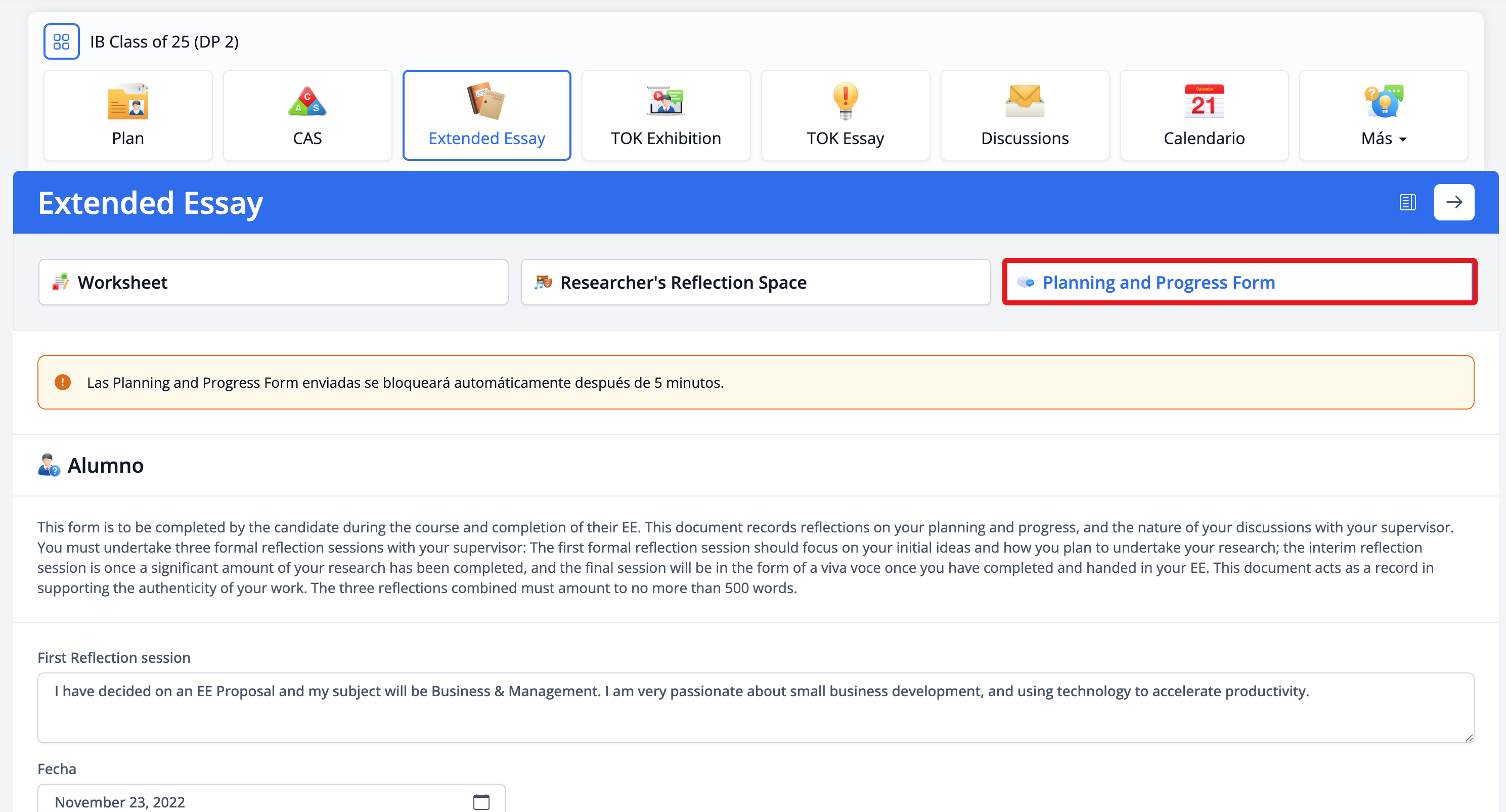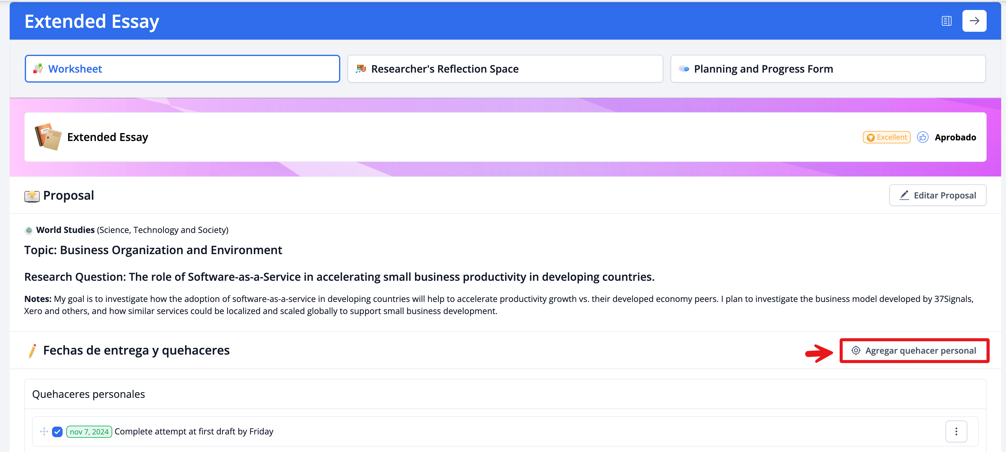 Después de guardar tu proyecto, podrás ver las próximas fechas de entrega y tareas pendientes del Extended Essay.