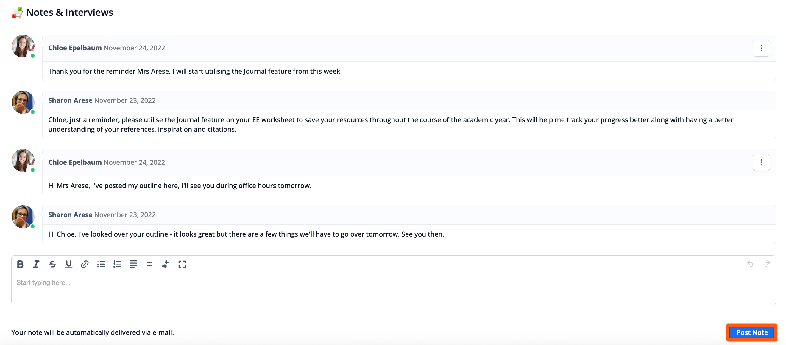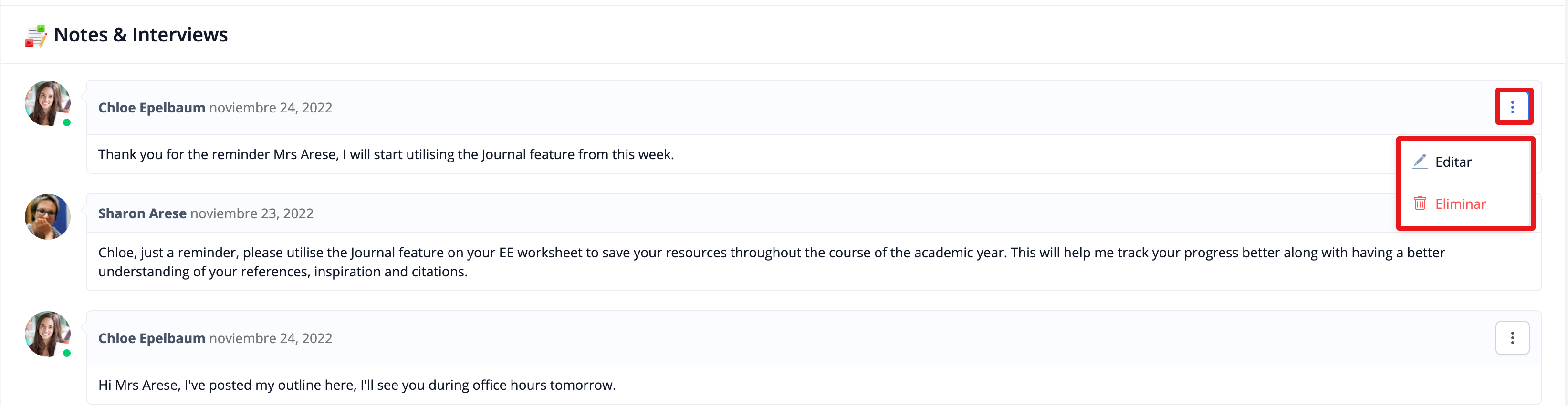 En la sección Notas y entrevistas, puedes dejar mensajes para tu supervisor de Extended Essay. Esta función es ideal para hacer preguntas y coordinar reuniones.