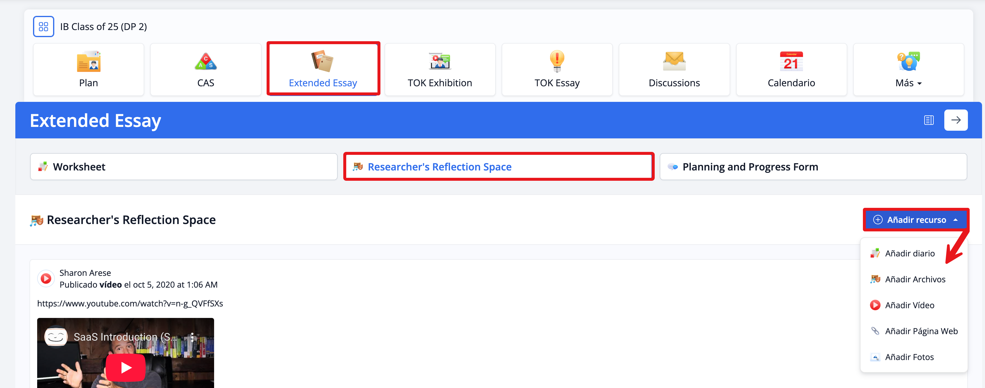 Desde Extended Essay, haz clic en Researcher's Reflection Space.