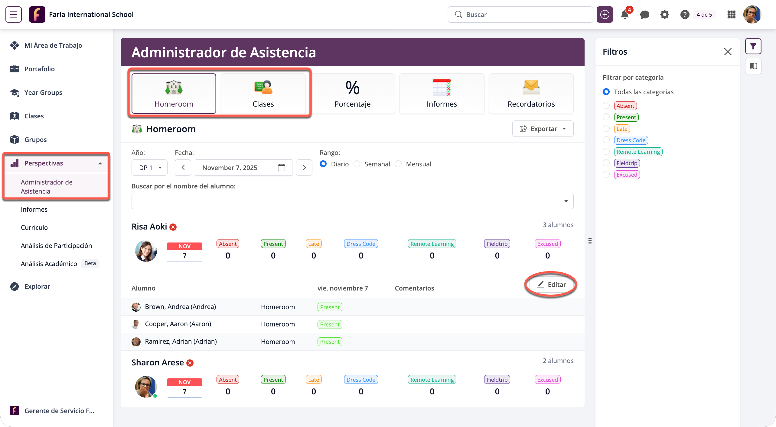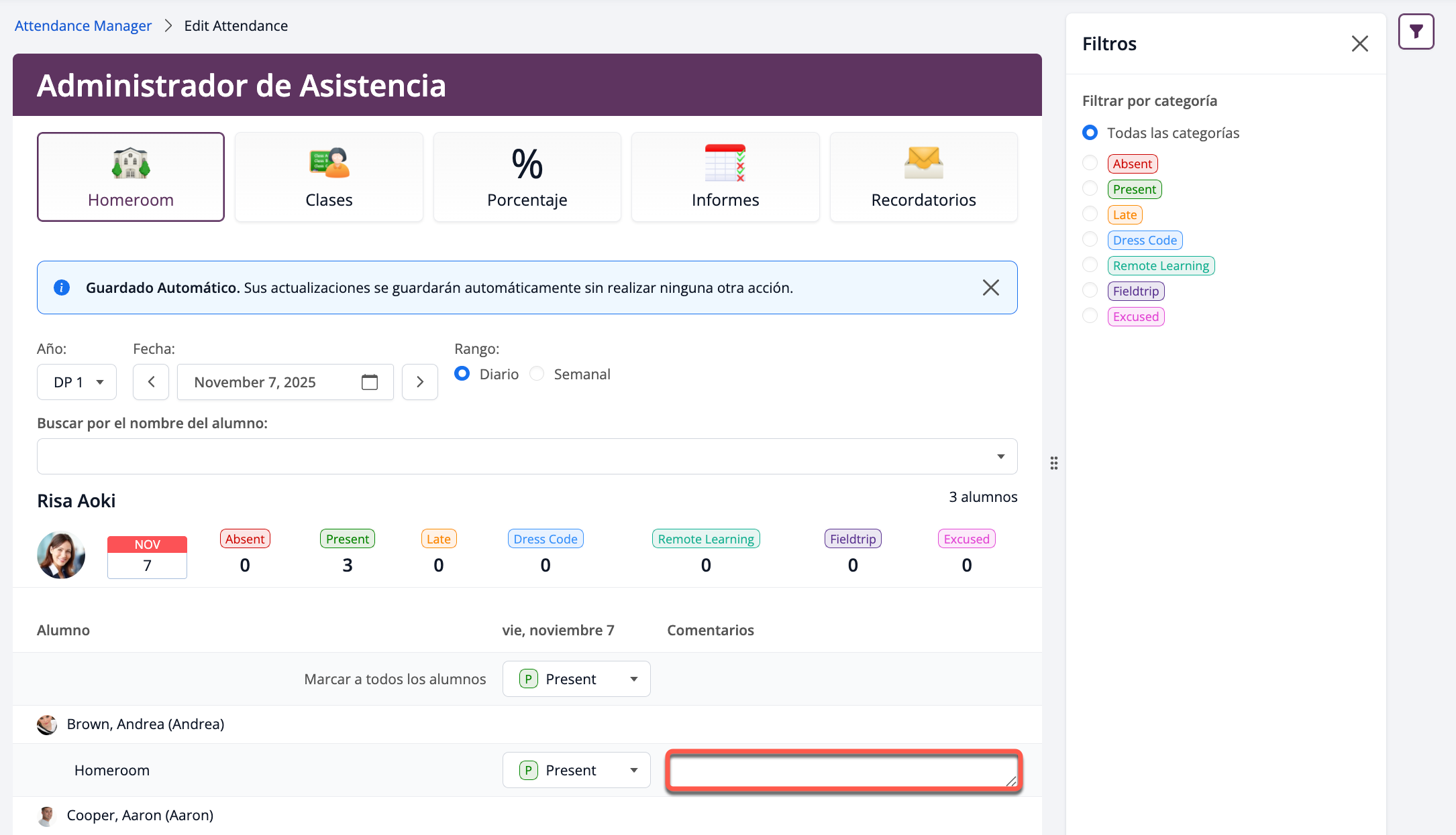 Además de editar o tomar la asistencia diaria aquí, puedes añadir comentarios pulsando el campo de texto junto a cada alumno. Estos comentarios serán visible para el profesor en la página de asistencia de su clase.