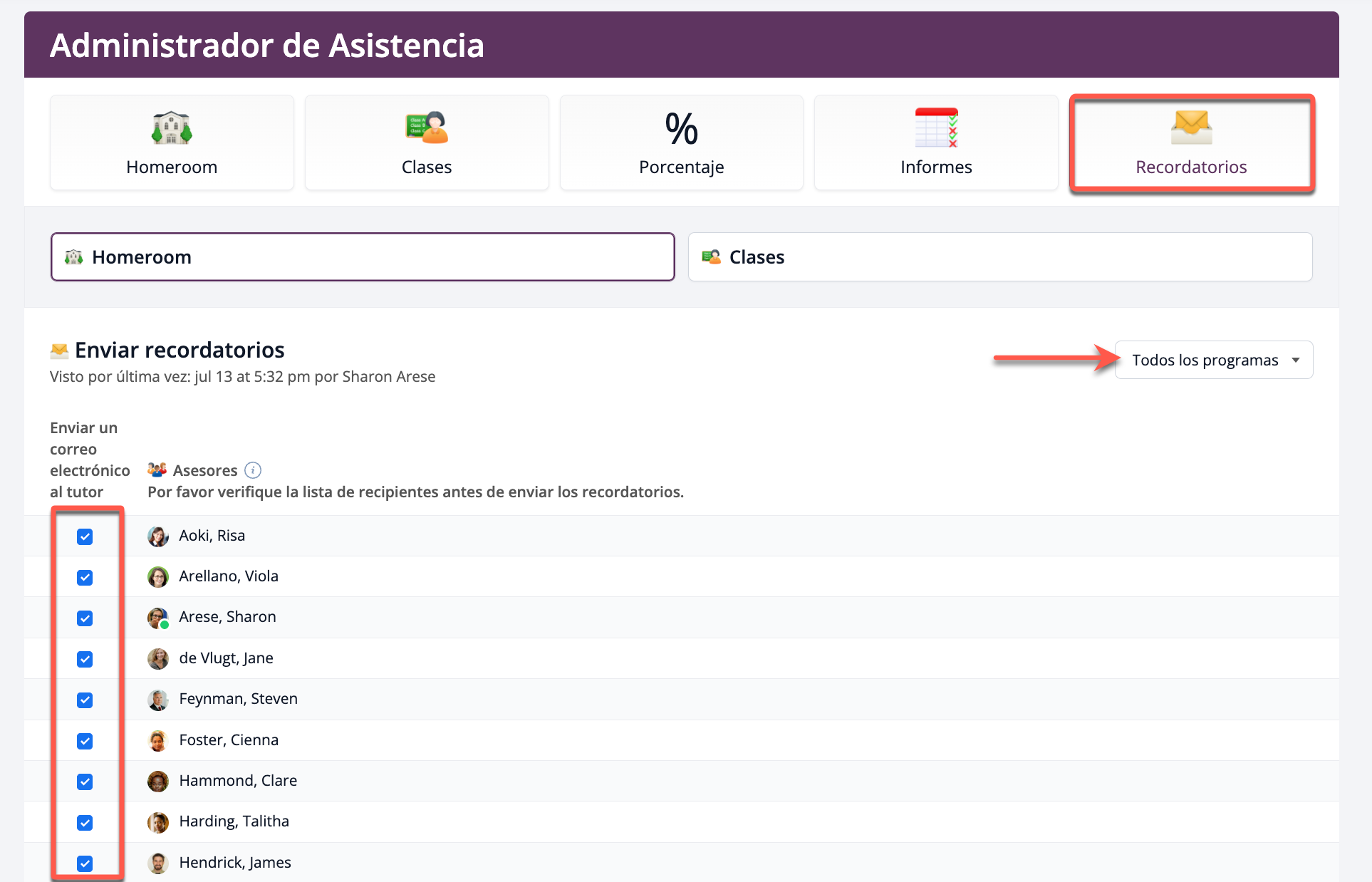 Los usuarios con acceso al Administrador de Asistencia pueden enviar recordatorios de asistencia a profesores y asesores seleccionados a través de la página Recordatorios. Selecciona el programa académico adecuado y marca la casilla para los profesores y asesores que deben recibir recordatorios de asistencia para la clase.