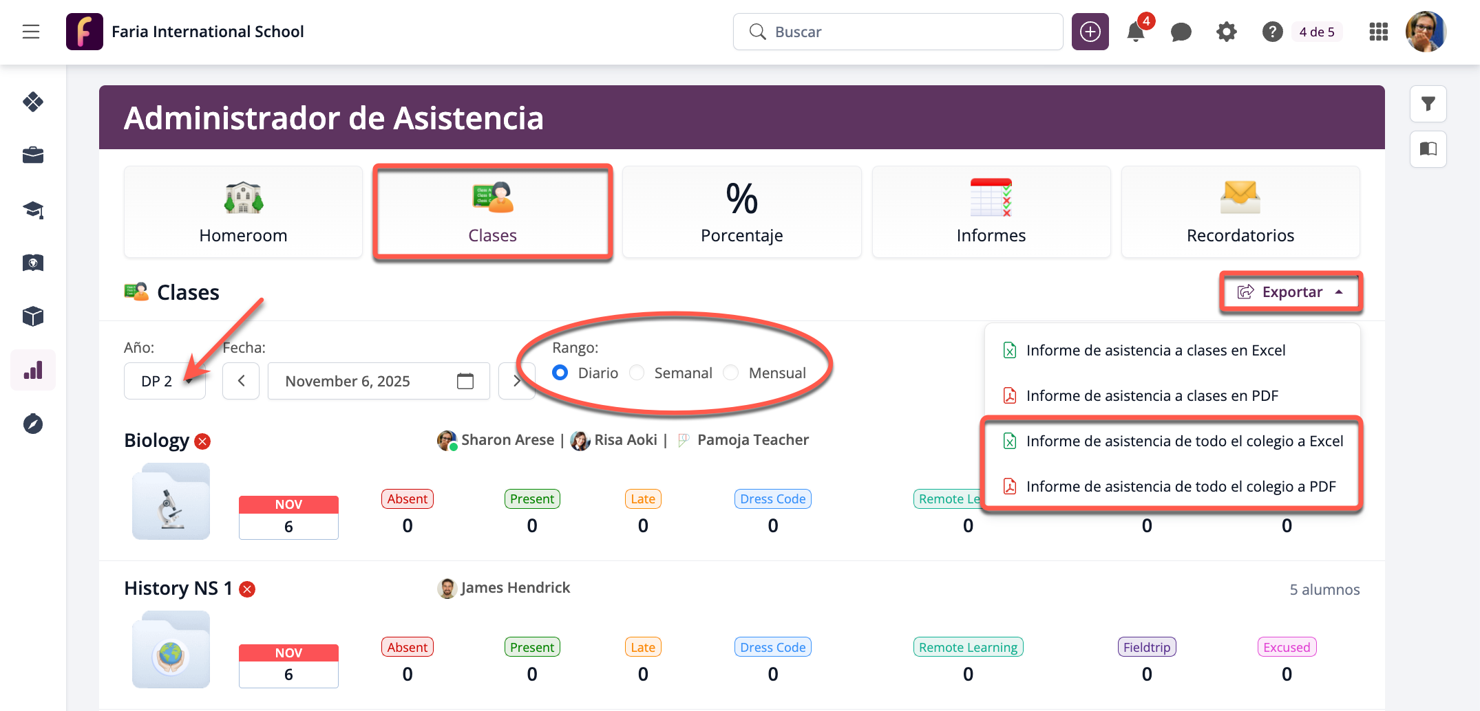 - Exportar la asistencia de toda la escuela para el día actual a PDF.
