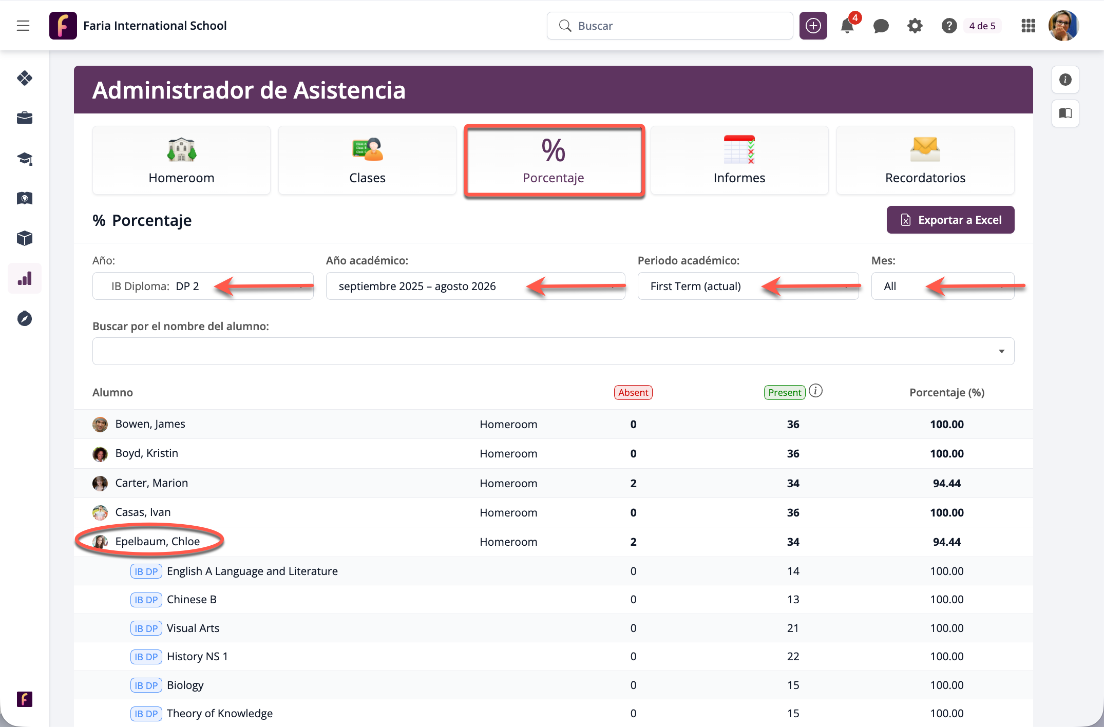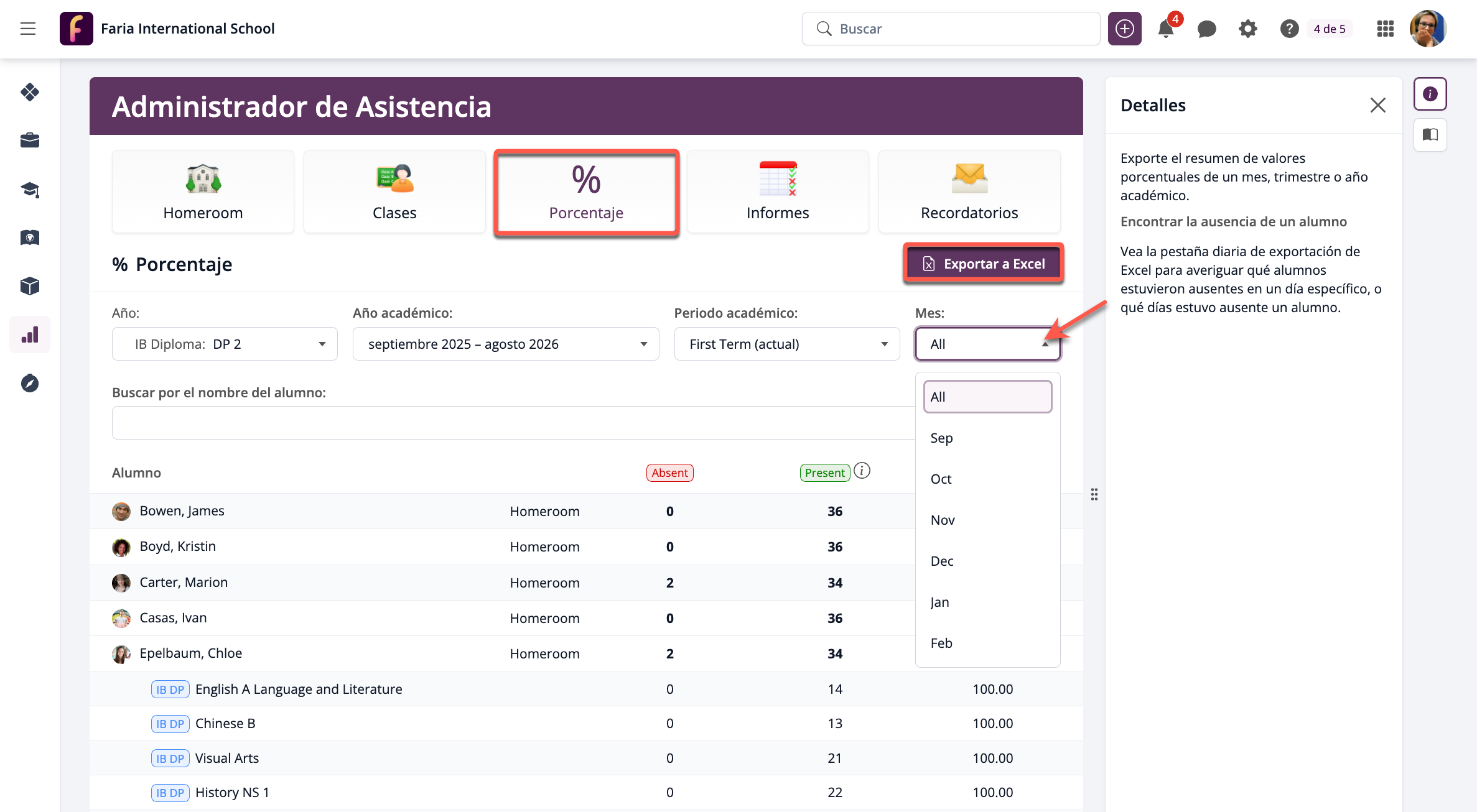 Para saber qué días ha faltado un alumno, ve al Administrador de Asistencia > Porcentaje > Exportar a Excel.