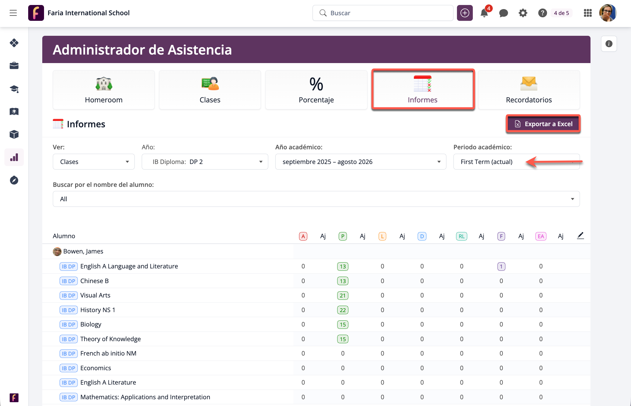 - Exportar el informe de asistencia para el nivel de grado y el rango seleccionados actualmente a Excel.