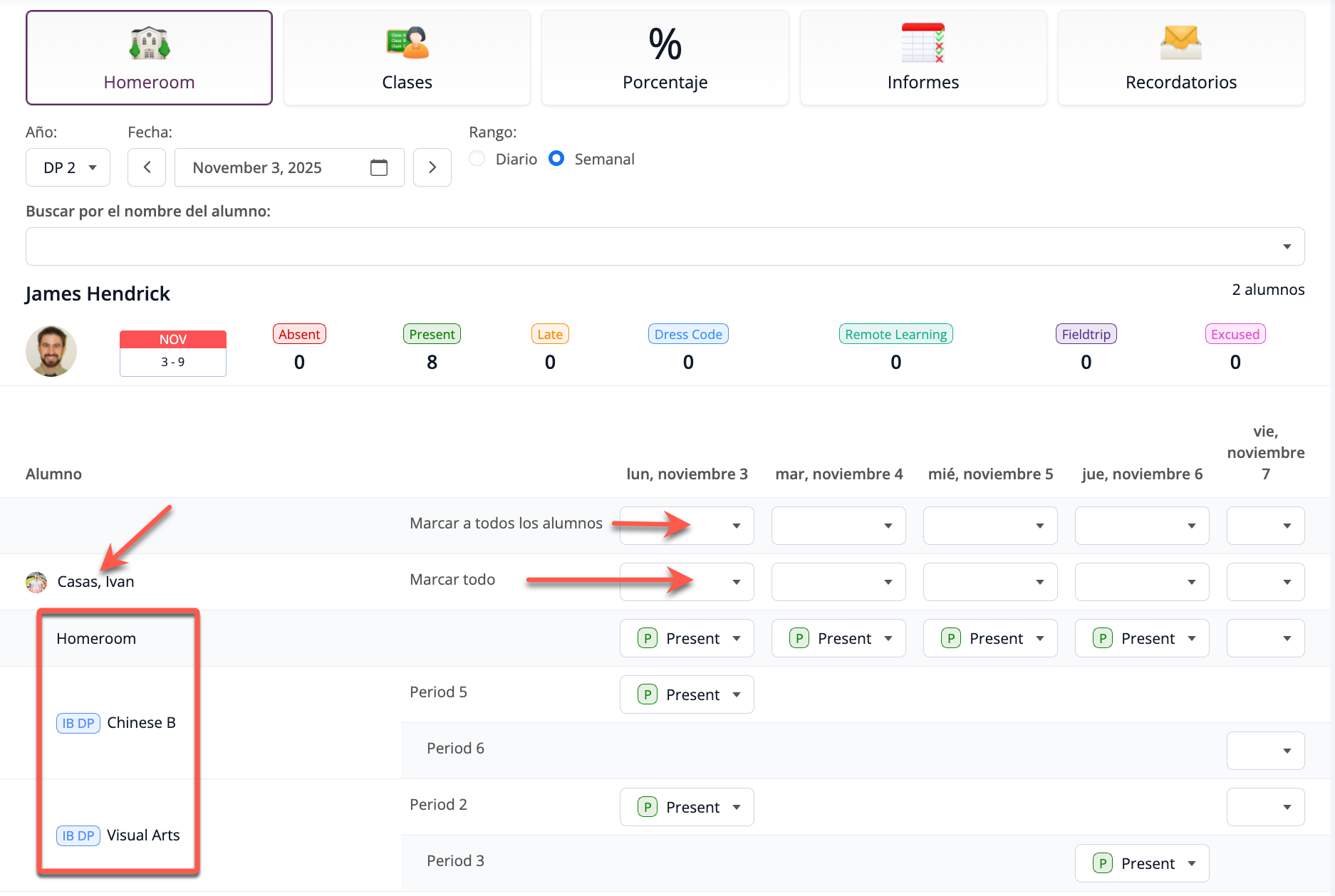 Expande la lista de clases de un alumno pulsando sobre el nombre del alumno. Esto te permitirá marcar la asistencia a todas las clases y a Homeroom en cualquier día de la semana para ese alumno utilizando el menú desplegable Marcar todo para el alumno.