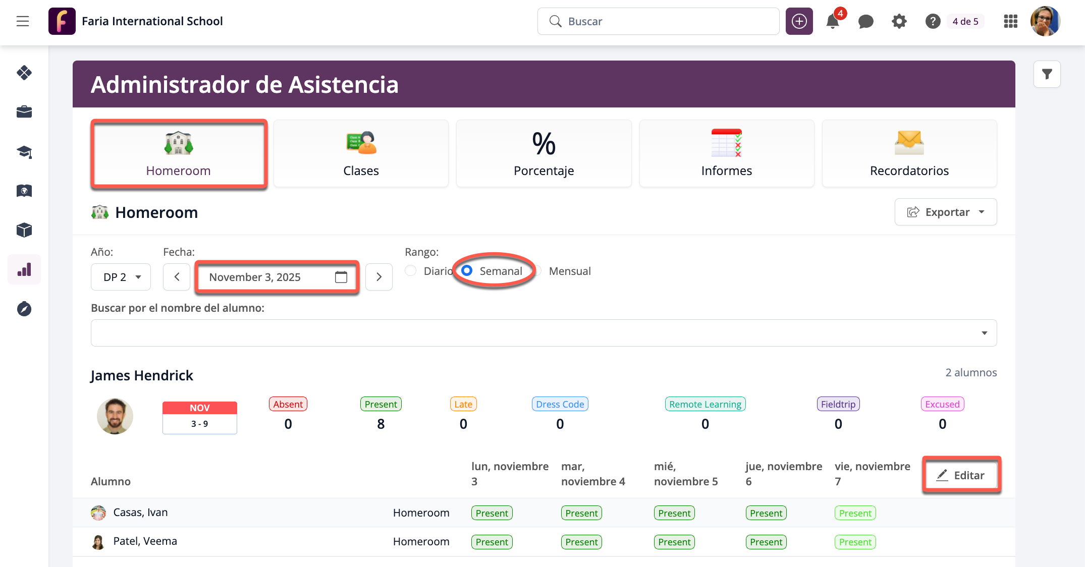 Si deseas actualizar la asistencia de los alumnos durante toda una semana, tanto para la asistencia a Homeroom como a las Clases, puedes hacerlo a través de la pestaña Homeroom del Administrador de asistencia. Allí, seleccione el nivel de grado adecuado y establezca el intervalo de fechas en Semanal. A continuación, establezca el primer día de la semana como fecha para que se registren todos los días laborables.