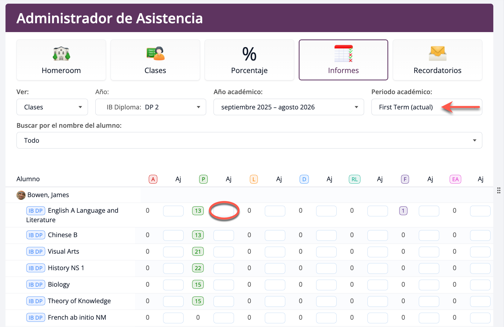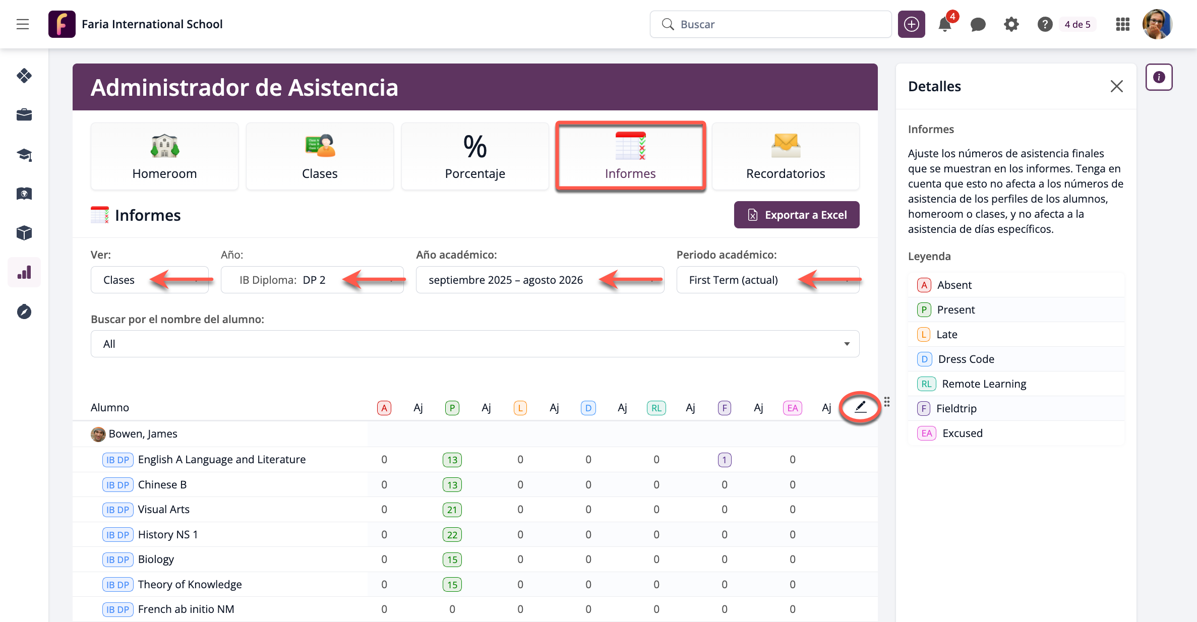 Para registrar o cambiar la asistencia de los alumnos por periodo académico, selecciona la pestaña Informes. Pulsa sobre el icono del lápiz en la parte derecha para añadir o cambiar los números de asistencia para una de las categorías que lo necesiten.