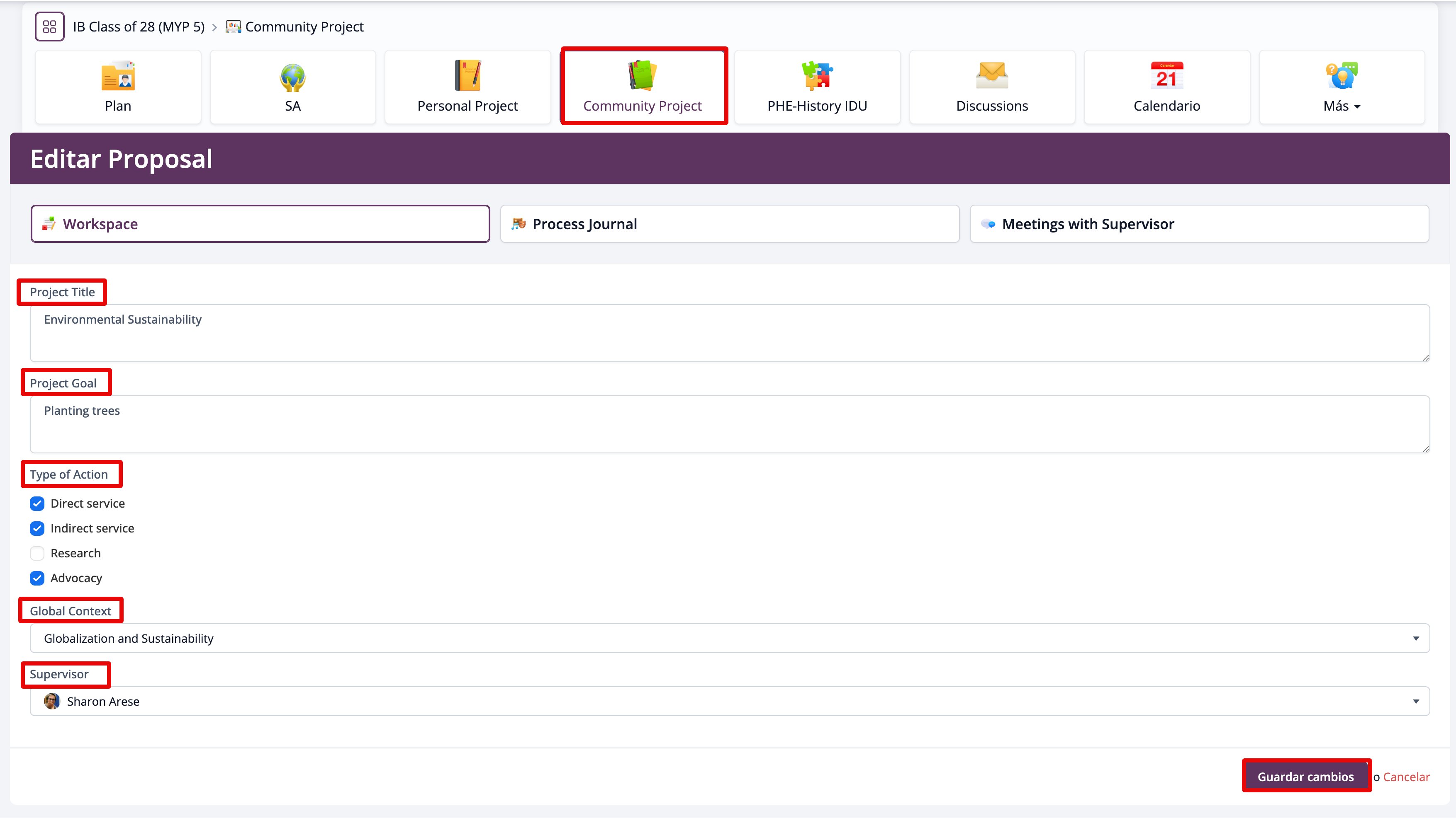 Ingresa tu Project Title, Project Goal, Type of Action(s) y Global Context para el Proyecto Comunitario, y selecciona a tu supervisor si aún no aparece asignado. Luego haz clic en Guardar cambios para guardar tu propuesta del Proyecto Comunitario.