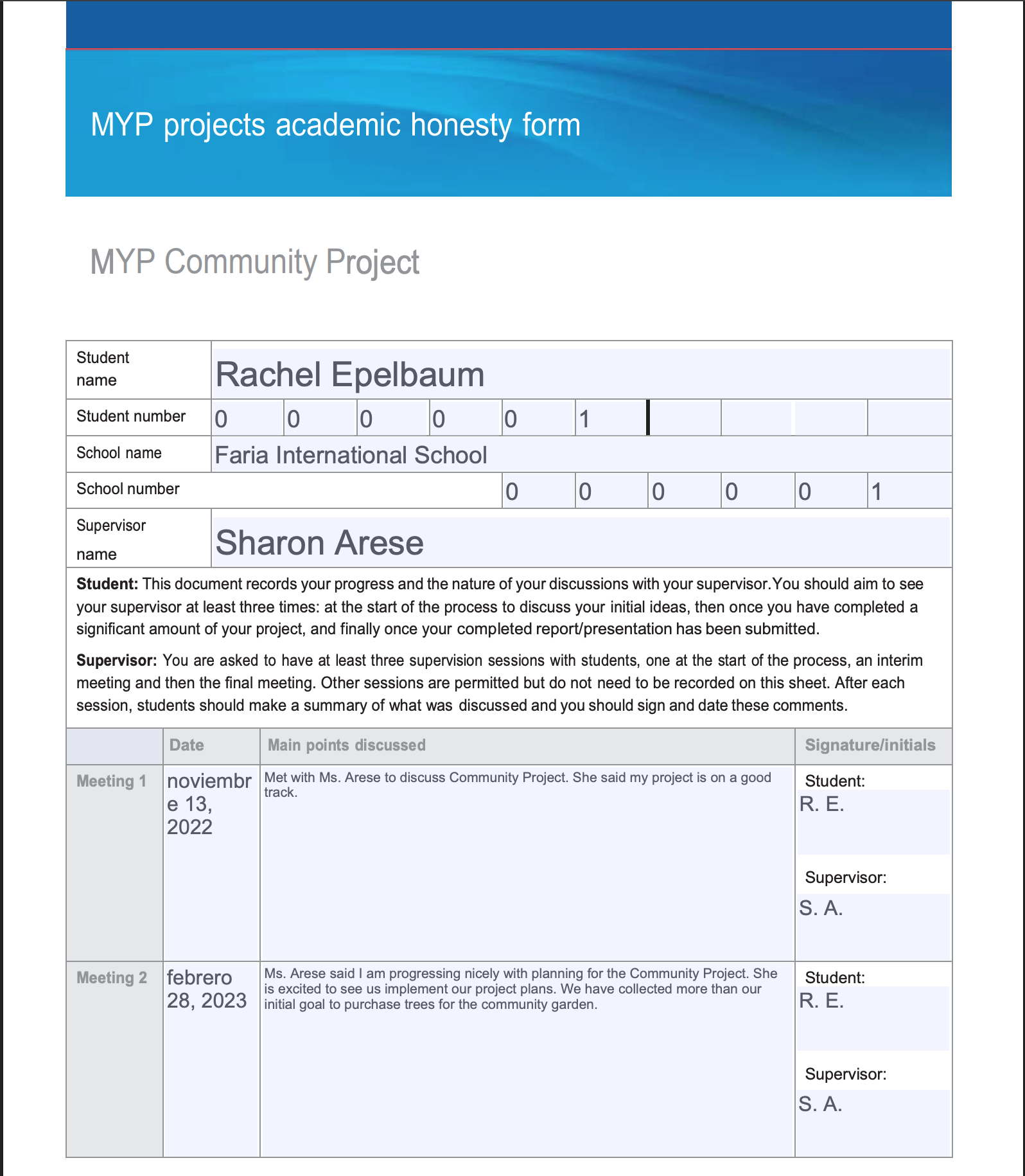 Tu supervisor puede preparar el Formulario de Honestidad Académica, incluyendo la información de la reunión. El PDF puede descargarse, imprimirse y firmarse según sea necesario.