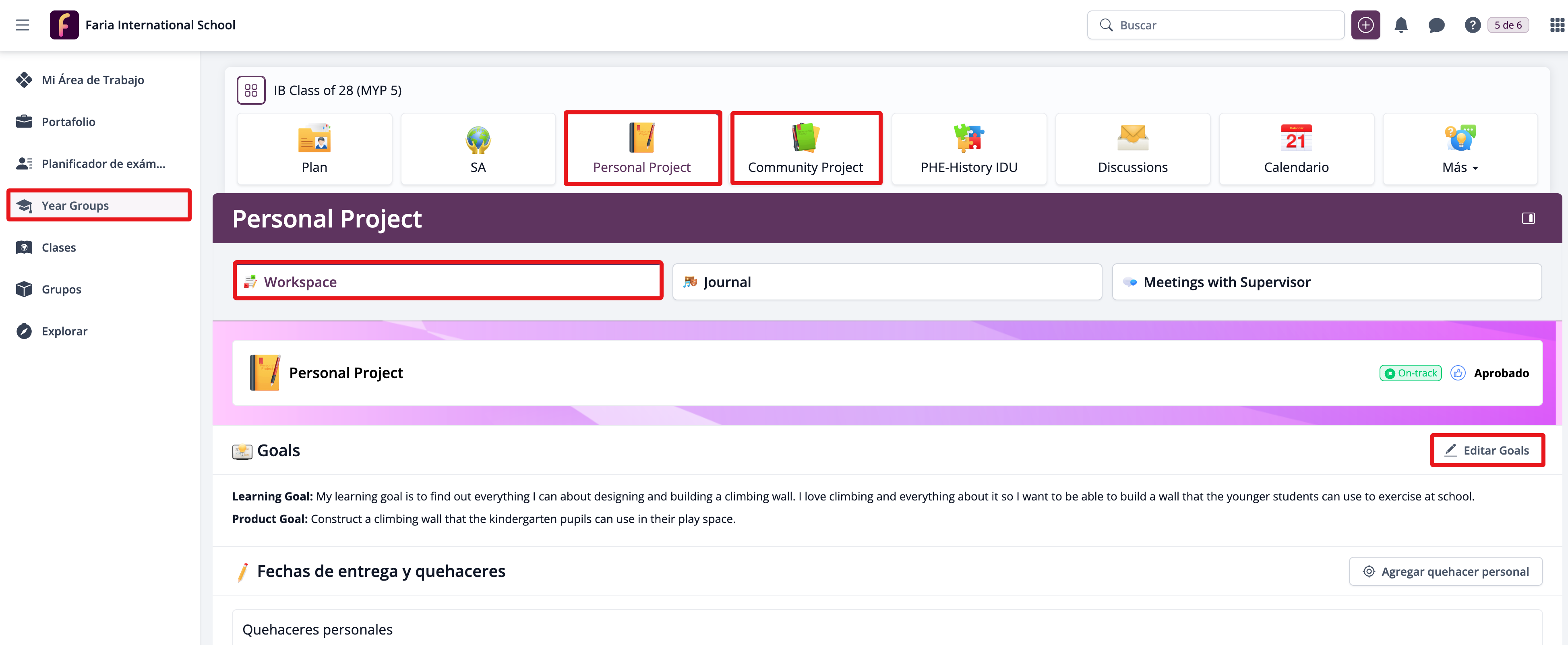Ve a Grupos de Año > Proyecto Personal / Comunitario. Aquí puedes ver y agregar todo el trabajo relacionado con tu Proyecto Personal o Comunitario. Haz clic en Editar Goals/Proposal dentro de la Hoja de Trabajo (Workspace) del proyecto para comenzar