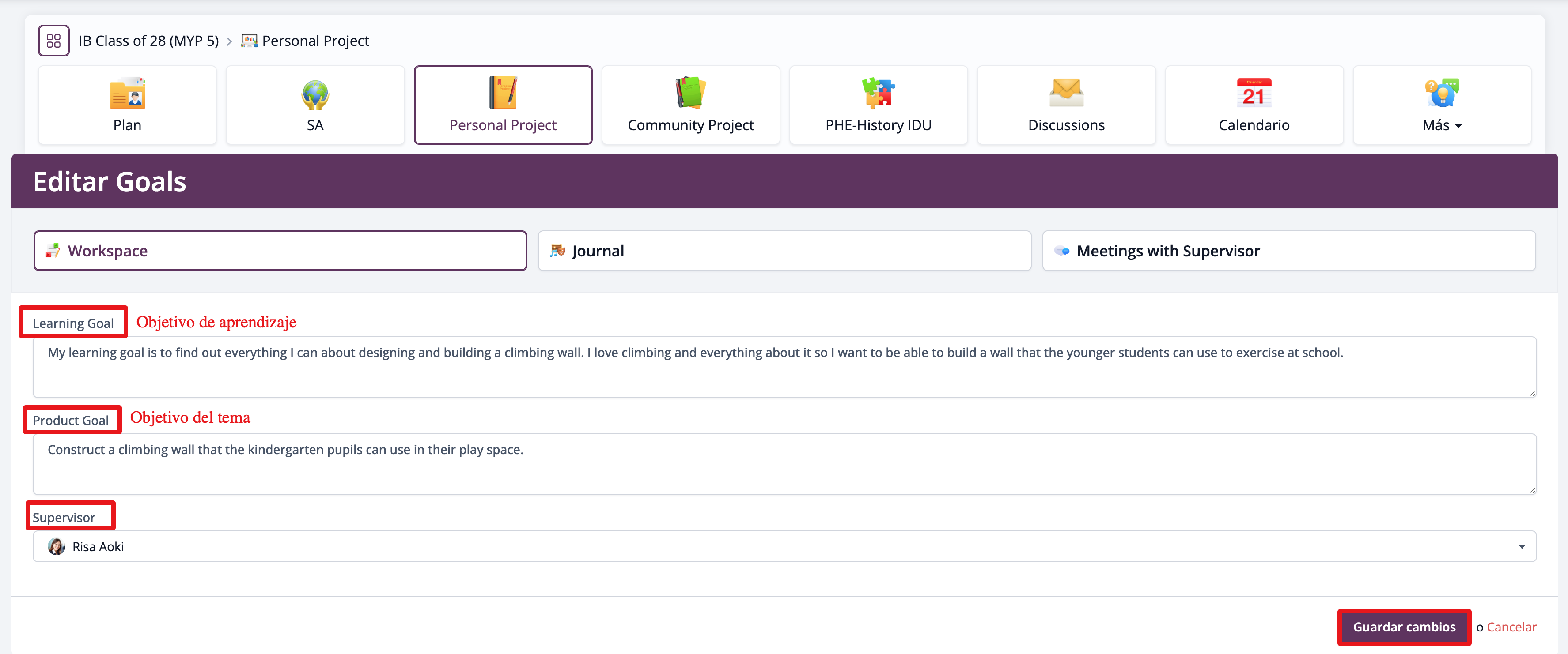Ingresa tu Learning Goal y Product Goal para el Proyecto Personal y selecciona a tu supervisor si aún no aparece asignado. Luego haz clic en Guardar cambios para almacenar tus objetivos del Proyecto Personal.