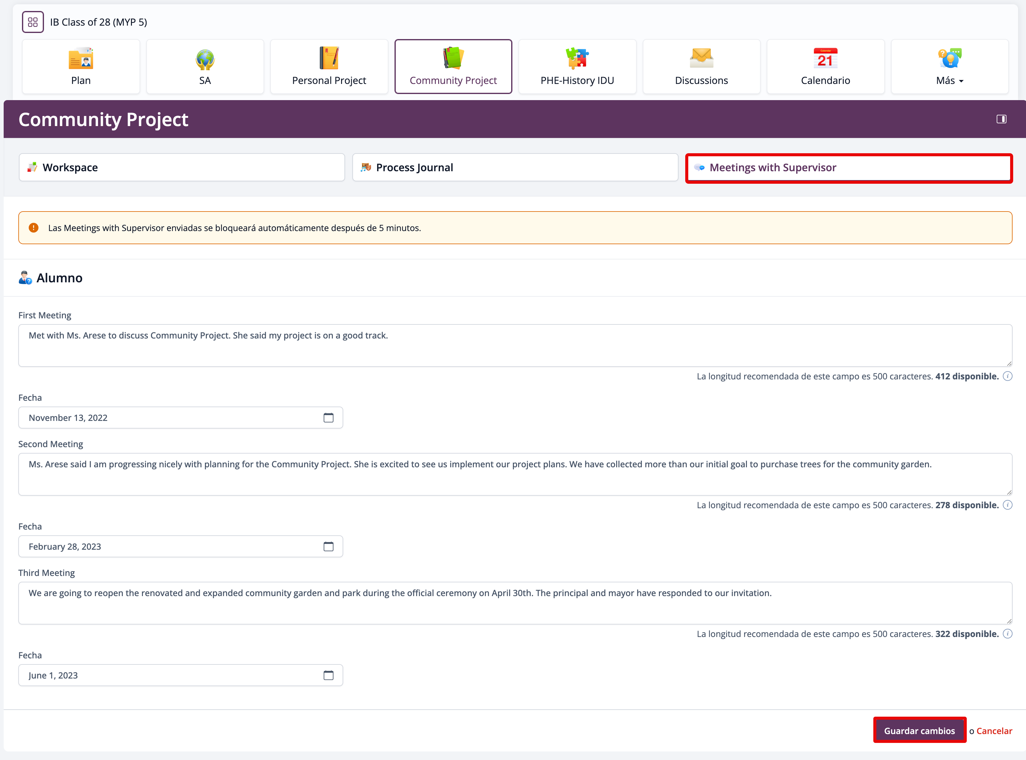 Usa el espacio Meetings with Supervisor para documentar las notas de tus reuniones con tu supervisor de proyecto. Tu supervisor también puede agregar notas de reunión.