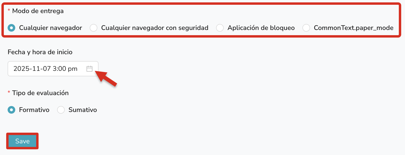 Paso 9: Selecciona la fecha y hora de inicio deseadas utilizando el calendario para programar tu prueba. Este ajuste también puede configurarse o modificarse más adelante desde la configuración de entrega.