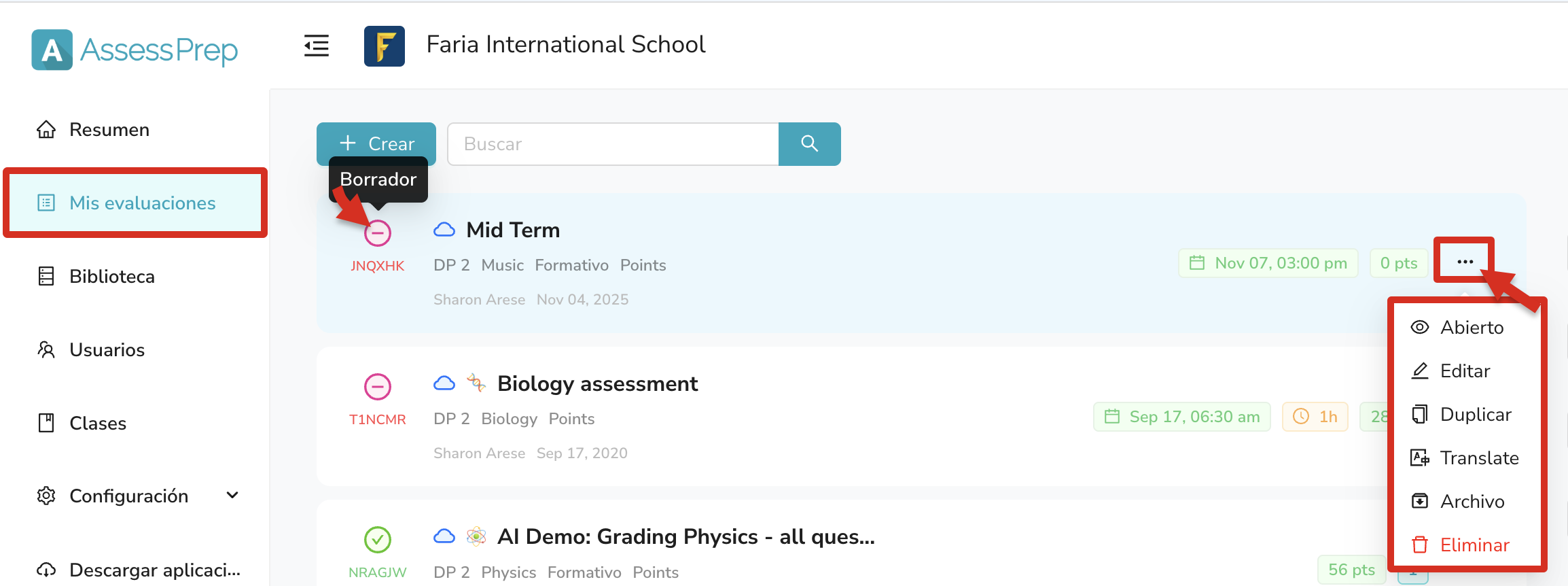 Los educadores pueden crear evaluaciones desde cero o duplicar una evaluación existente desde la biblioteca de AssessPrep.