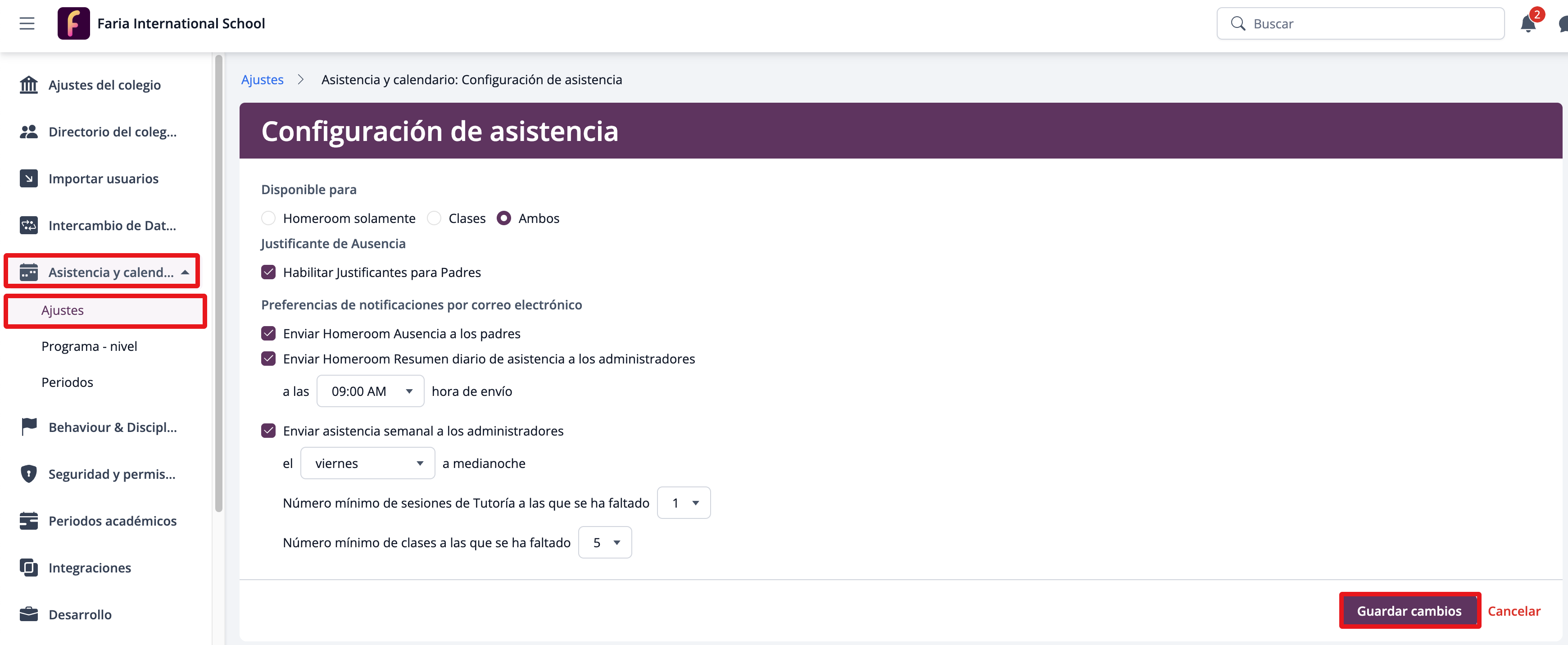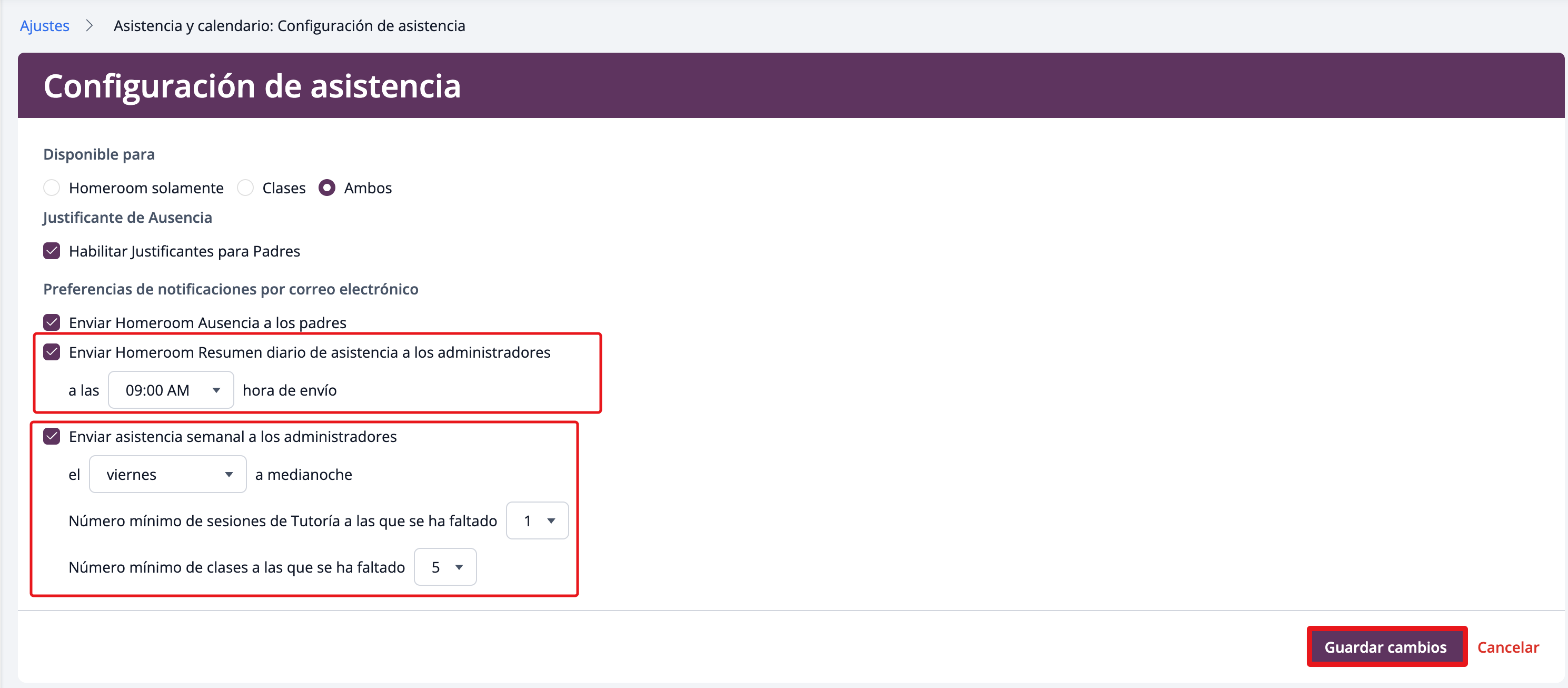 Configura los ajustes de asistencia a nivel escolar. Indica si la asistencia estará disponible para Homeroom, Clases o ambos.