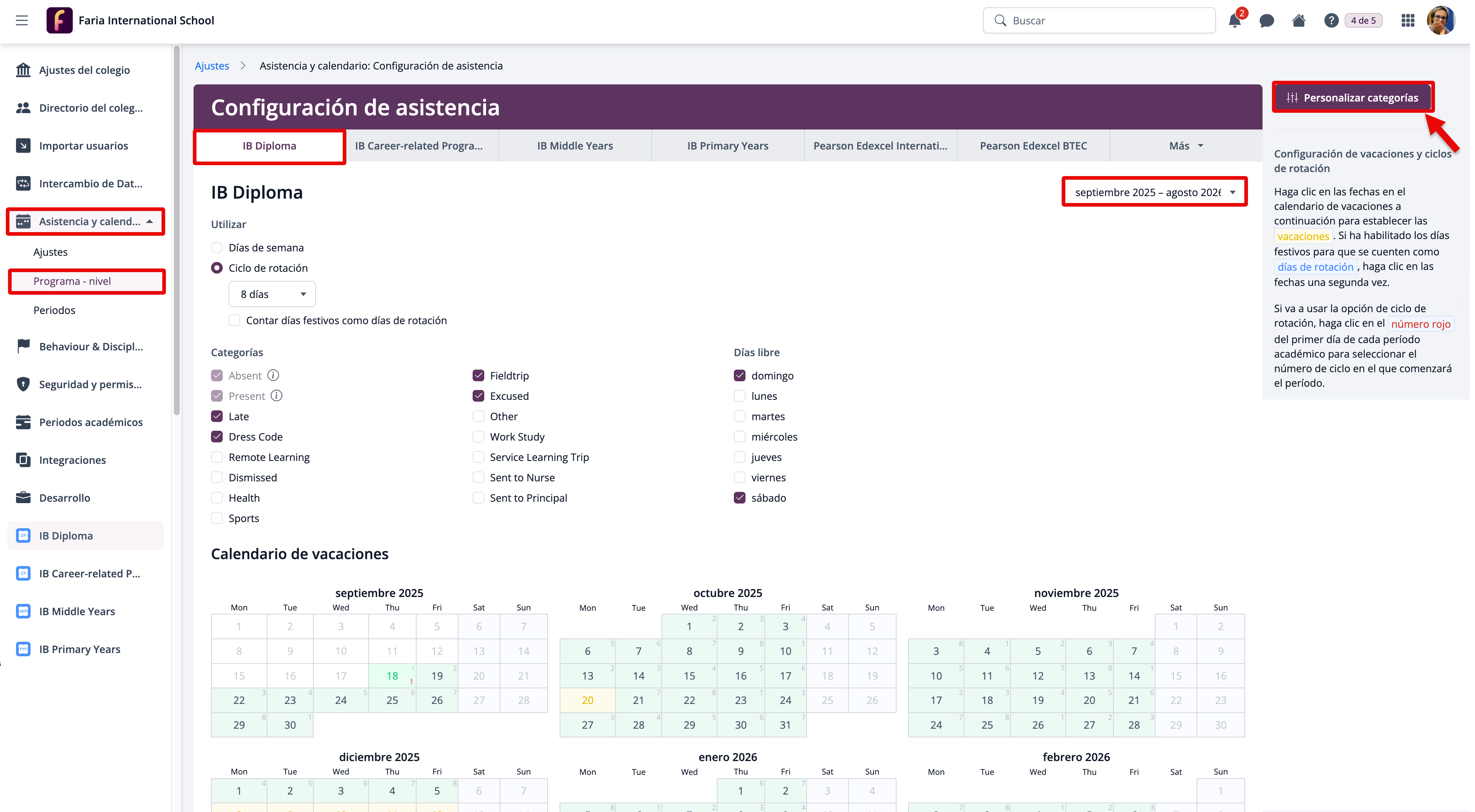 Puedes personalizar las categorías para adaptarlas mejor a la nomenclatura y el esquema de colores del colegio.