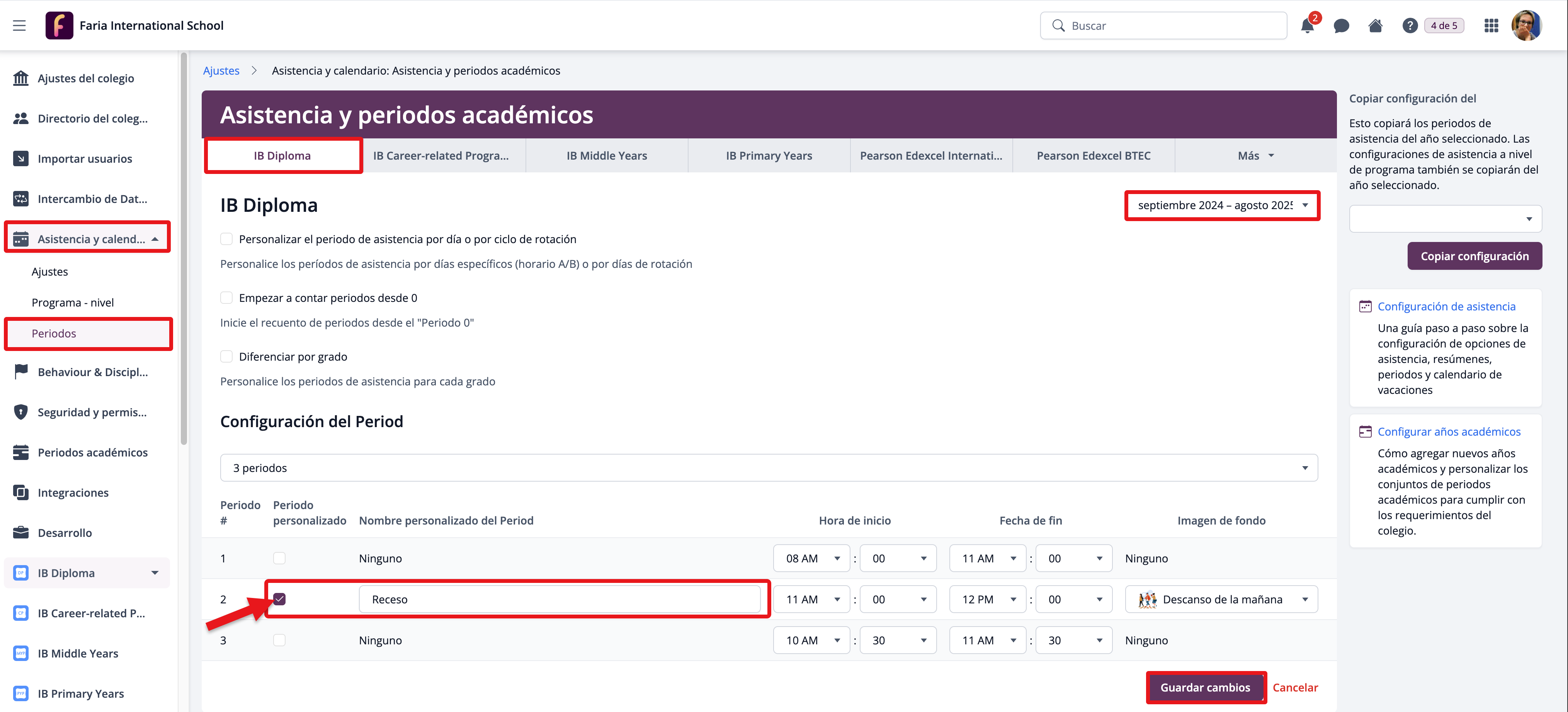 Desde Asistencia y calendario > Períodos, puedes personalizar el número y la duración de los períodos para el año académico. Con las nuevas opciones de personalización, ahora puedes incluir períodos personalizados que no correspondan a clases, o definir número y duración de períodos específicos según el nivel de grado y el día del ciclo rotativo de un programa.