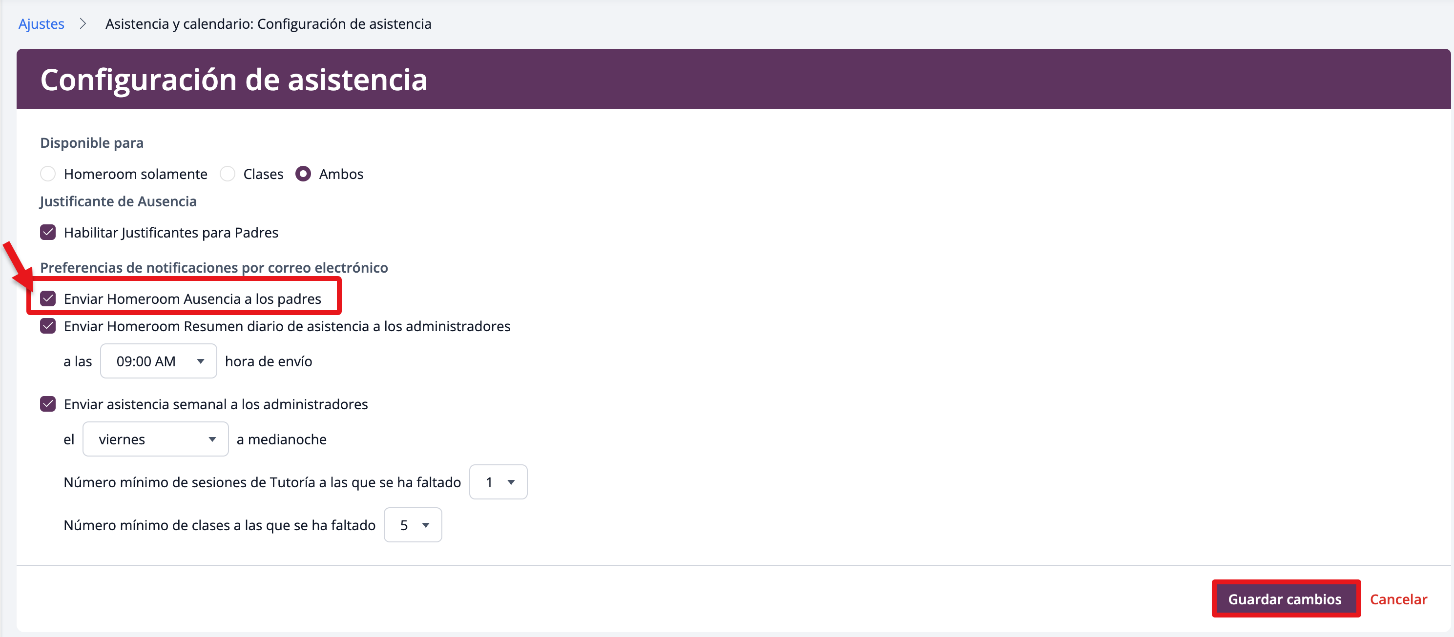 Activa Enviar Homeroom Ausencia a los padres para enviar automáticamente correos de notificación a los padres cuando el estudiante sea marcado como ausente en Homeroom.