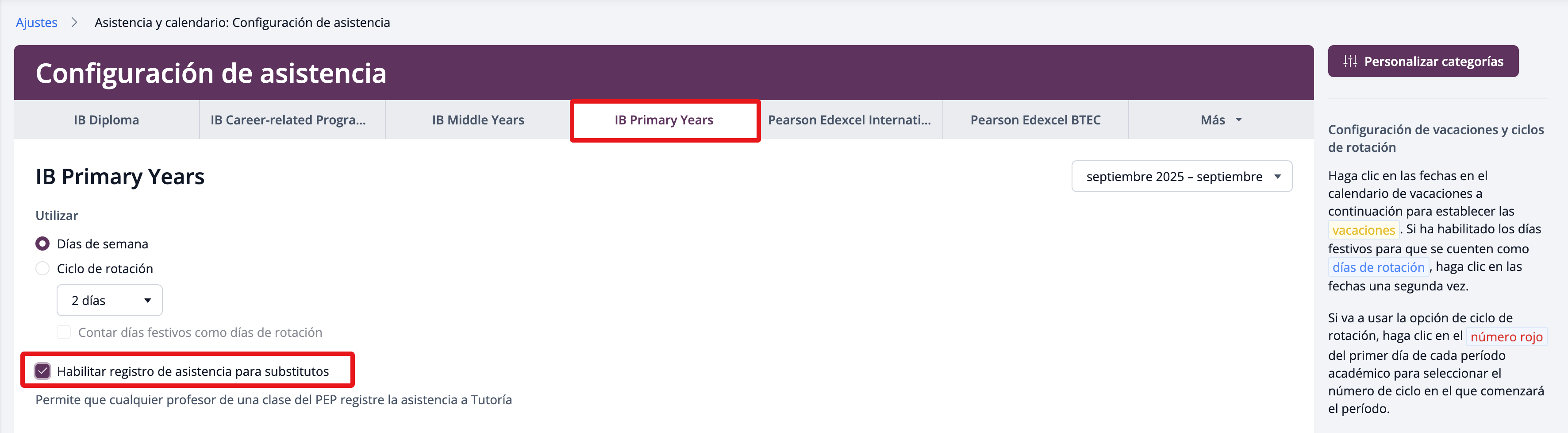 En la pestaña Nivel del programa (PYP), marca la casilla Habilitar registro de sustitutos, lo que permitirá que cualquier profesor asignado a la clase pueda tomar la asistencia de Homeroom Advisor.