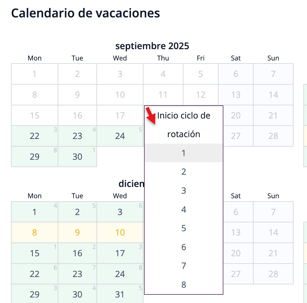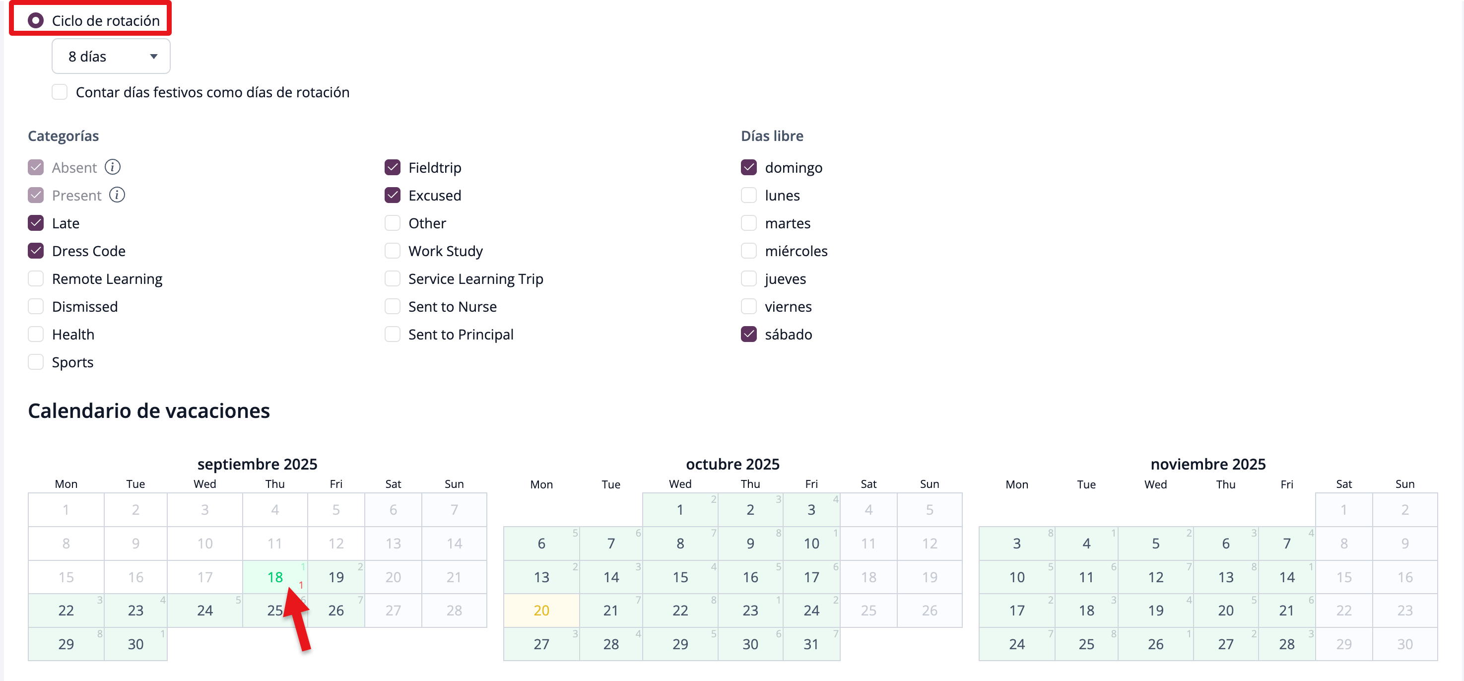 Para los colegios que utilizan un ciclo rotativo, es posible ajustar el número del primer día del ciclo del periodo académico haciendo clic en la primera fecha dentro del calendario de días festivos.