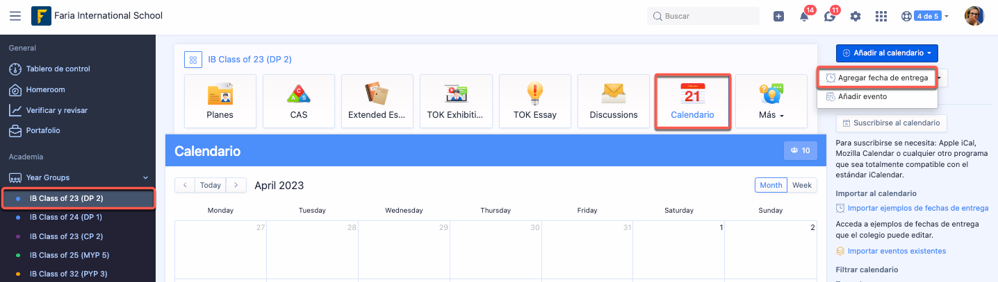 TurnItIn puede habilitarse tanto en Tareas de clase como en Fechas de entrega de los grupos de año. Vaya a la pestaña Calendario del grupo y haga clic en Añadir nueva fecha de entrega. Tenga en cuenta que la creación de fechas límite está restringida a usuarios con nivel de administrador.