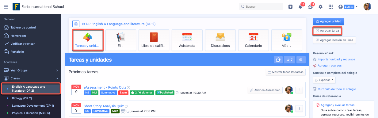Vaya a Clase > Tareas y unidades y pulse el botón Agregar tarea en el panel derecho.