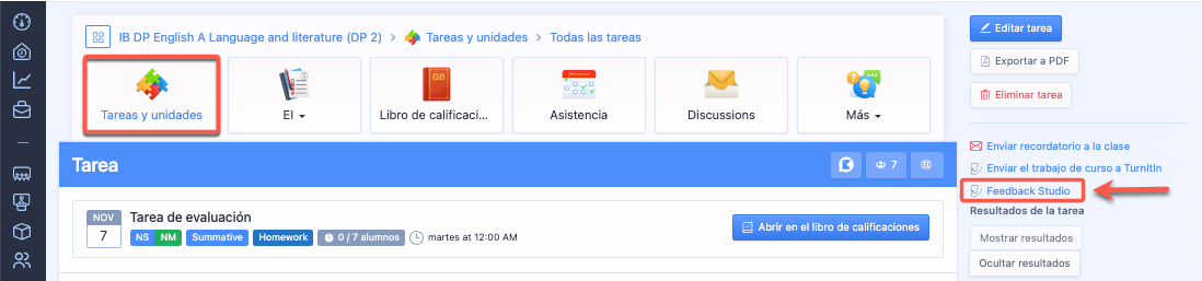 Pulse Ajustes > Ajustes opcionales para configurar los ajustes de TurnItIn para esta tarea. Pulse aquí para obtener más instrucciones sobre cómo configurar los ajustes de tarea de Feedback Studio.
