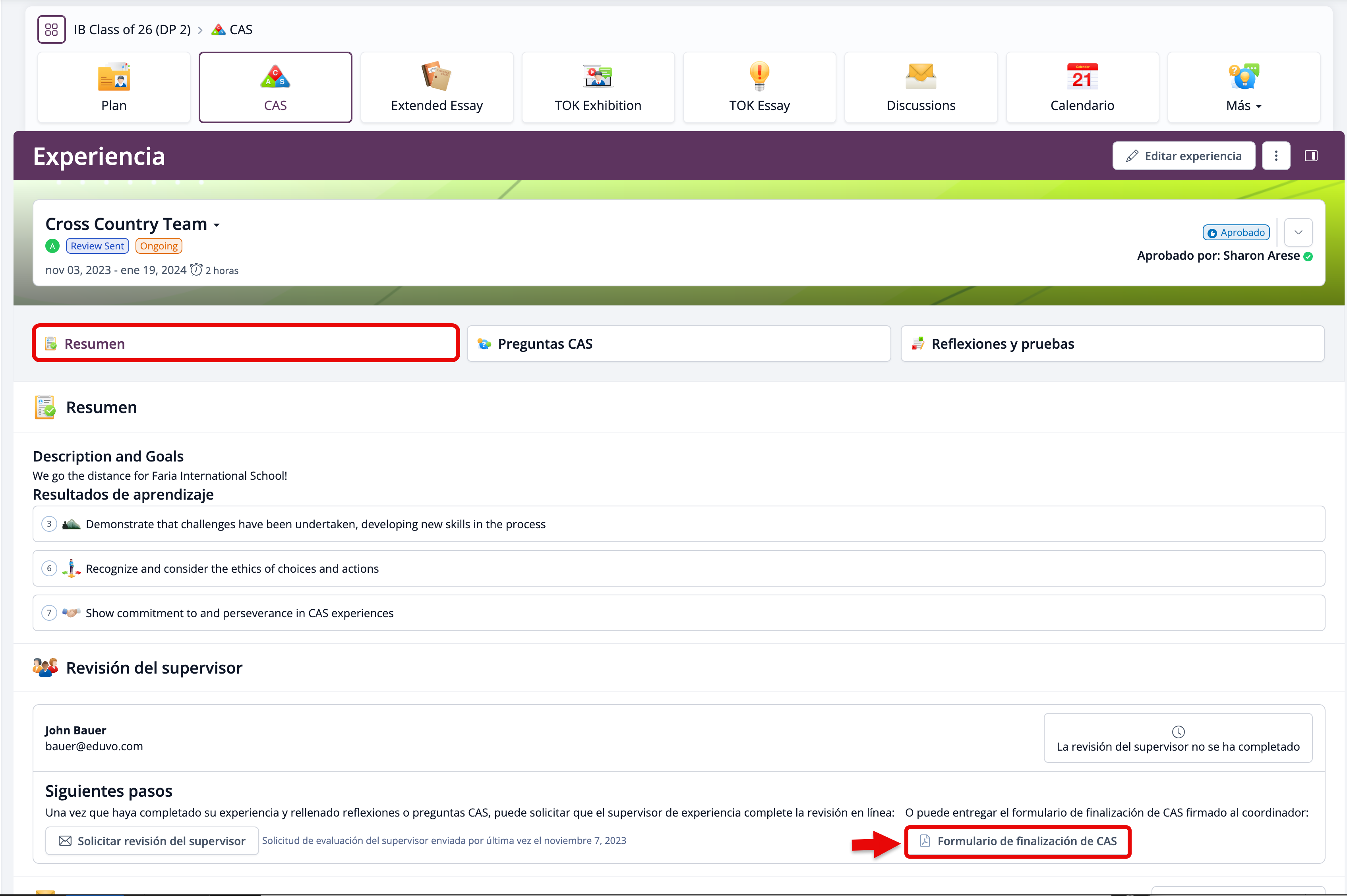 El Formulario de Finalización de CAS no incluye las Reflexiones y pruebas. Estos elementos pueden entregarse por separado al Asesor de CAS o al Coordinador del IB.