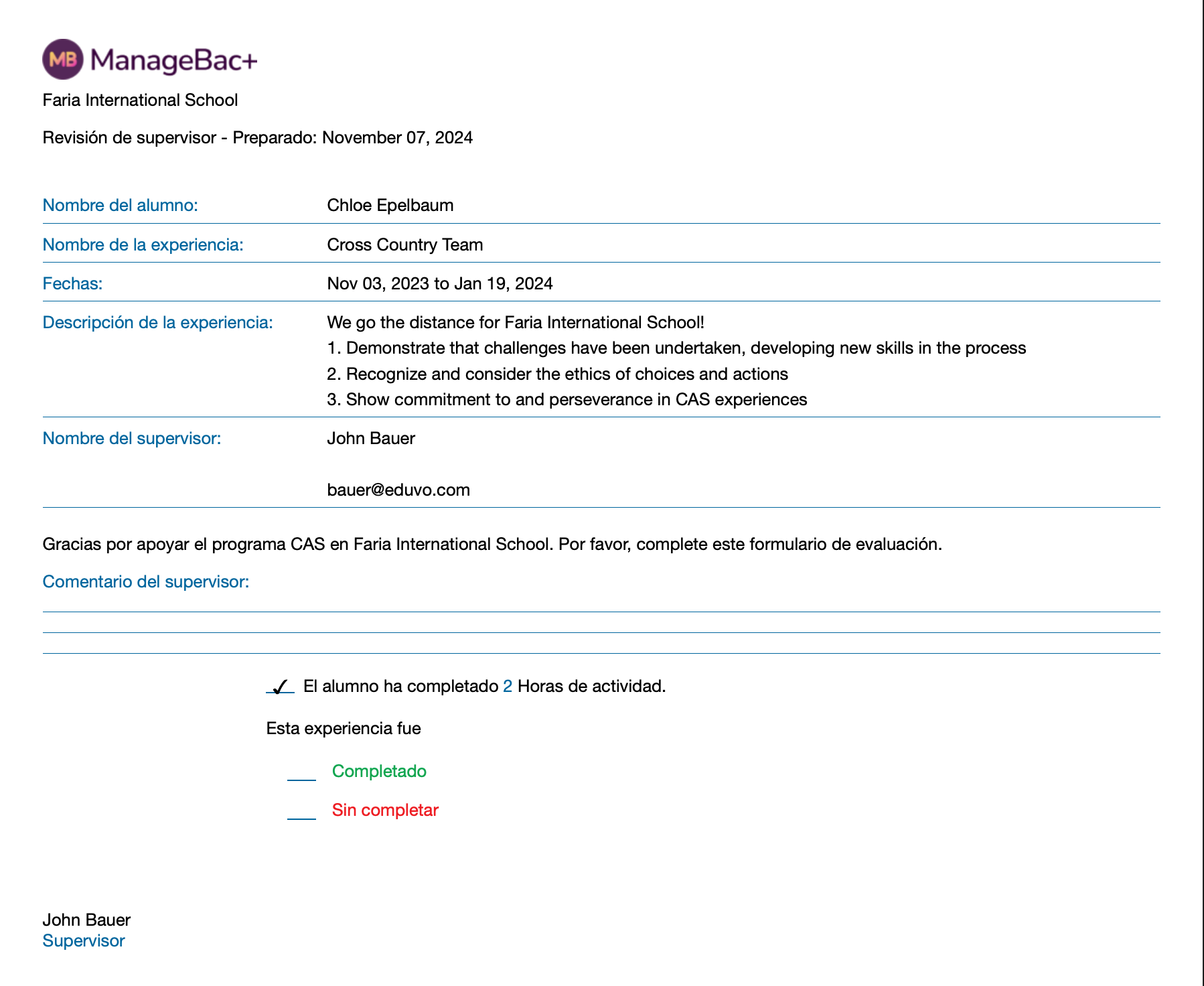 Si necesitas actualizar la información de contacto del supervisor o realizar cambios después de que la experiencia haya sido marcada como Completada, por favor notifícalo a tu Asesor de CAS.
