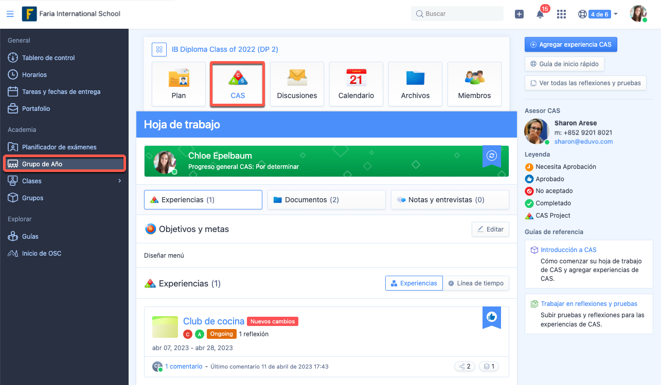 Su hoja de trabajo CAS tiene herramientas de análisis diseñadas para ayudarle a realizar un seguimiento de sus experiencias CAS. Dependiendo de las opciones habilitadas por su escuela, puede visualizar sus experiencias por: