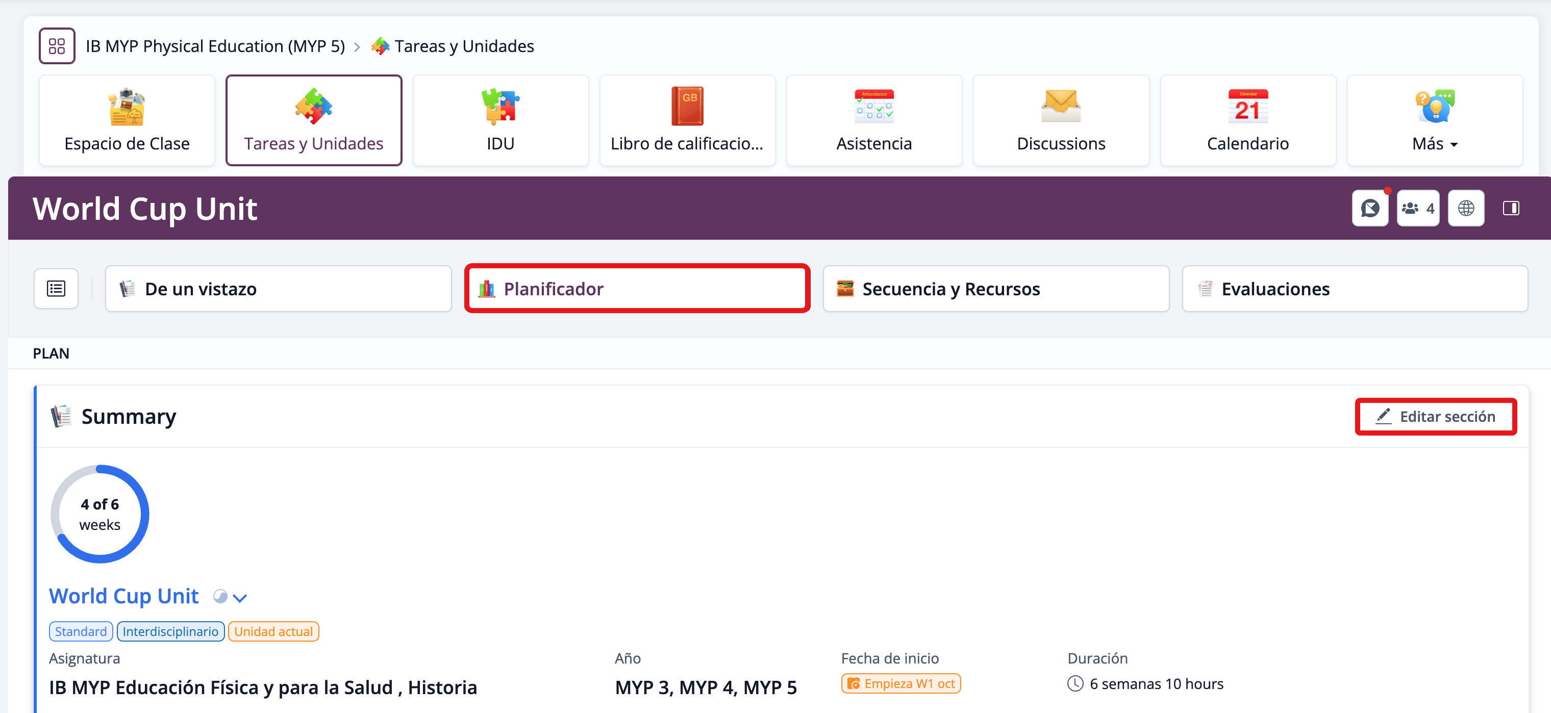 También puedes seleccionar una unidad existente, hacer clic en el título de la unidad y luego en Editar sección, según el apartado que desees modificar en el Planificador.