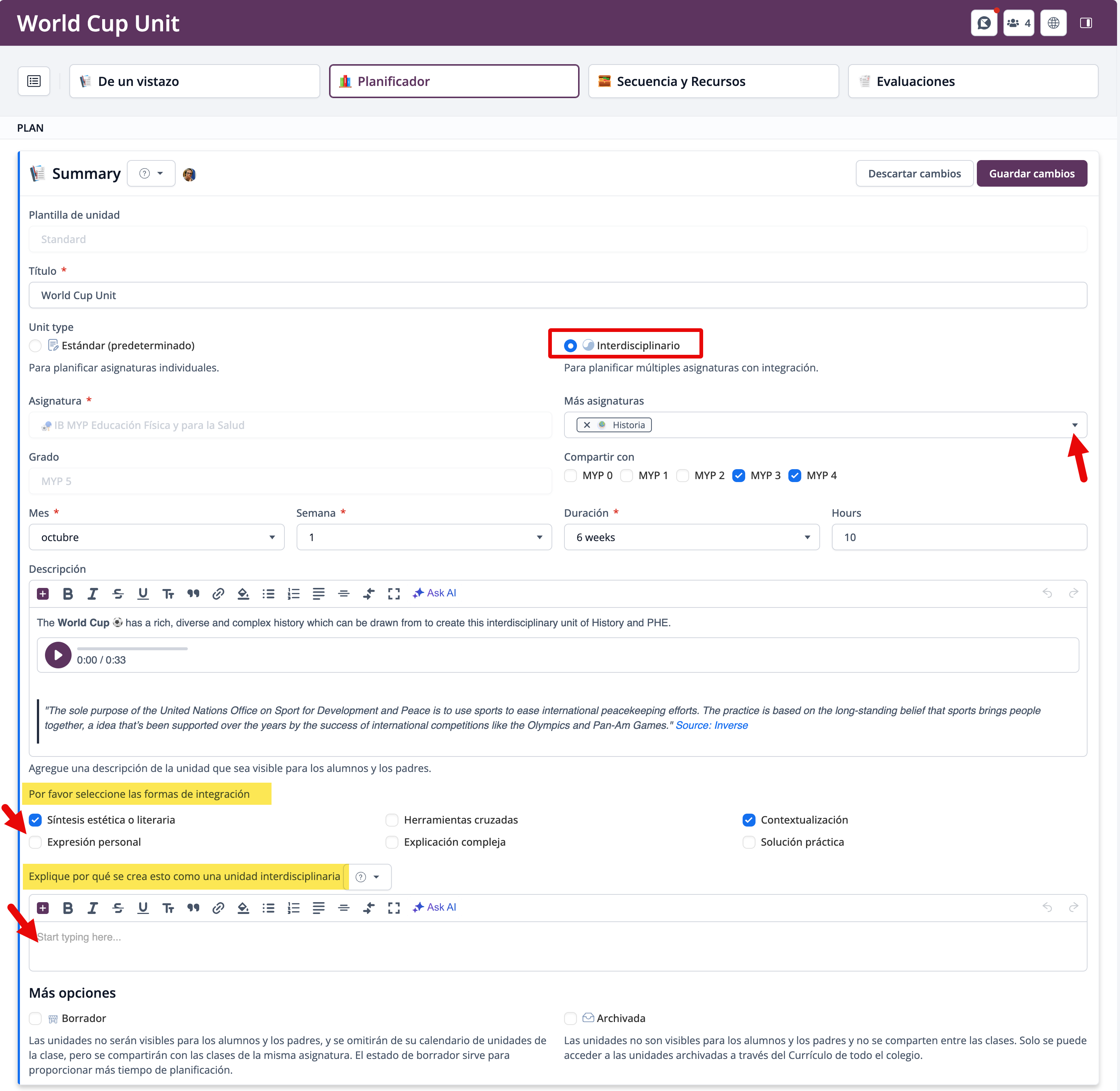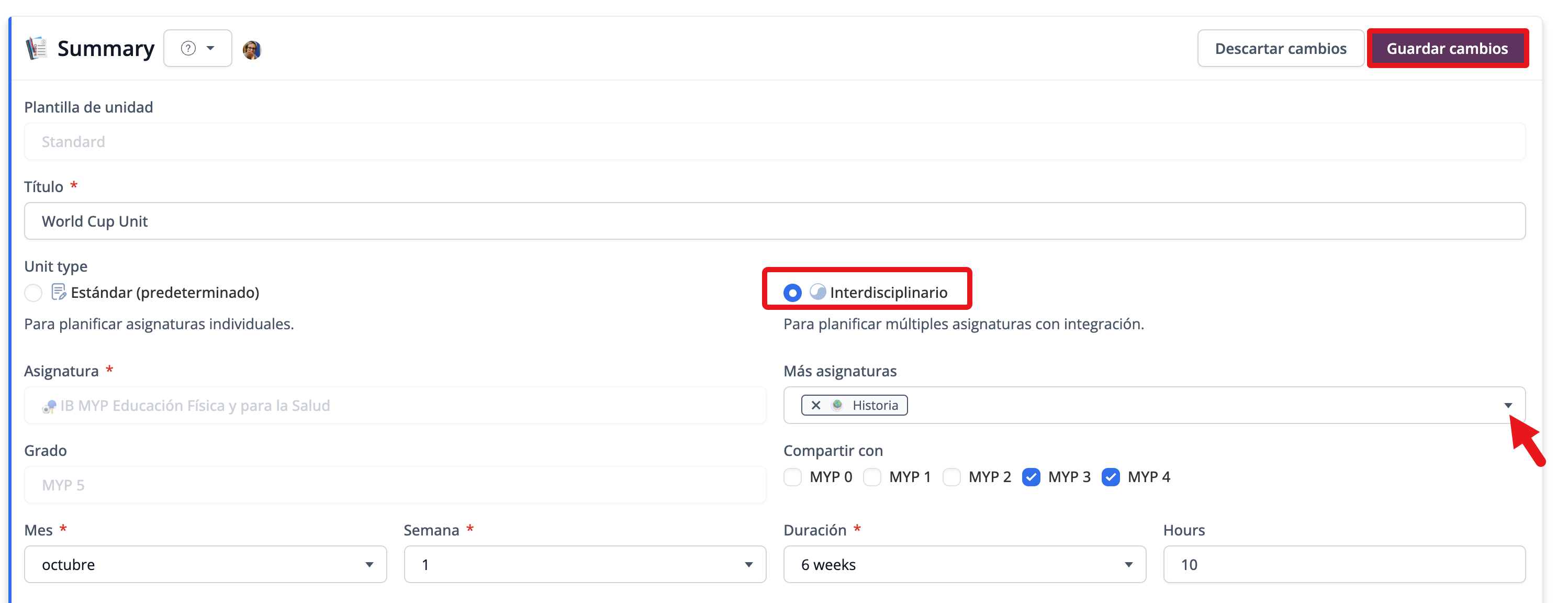 Dentro de la sección de Summary, selecciona el tipo de Unidad Interdisciplinario para abrir el menú desplegable de Más asignaturas. Allí, selecciona la(s) asignatura(s) con la(s) que se compartirá esta unidad. Esto marcará la unidad como Unidad Interdisciplinaria.
