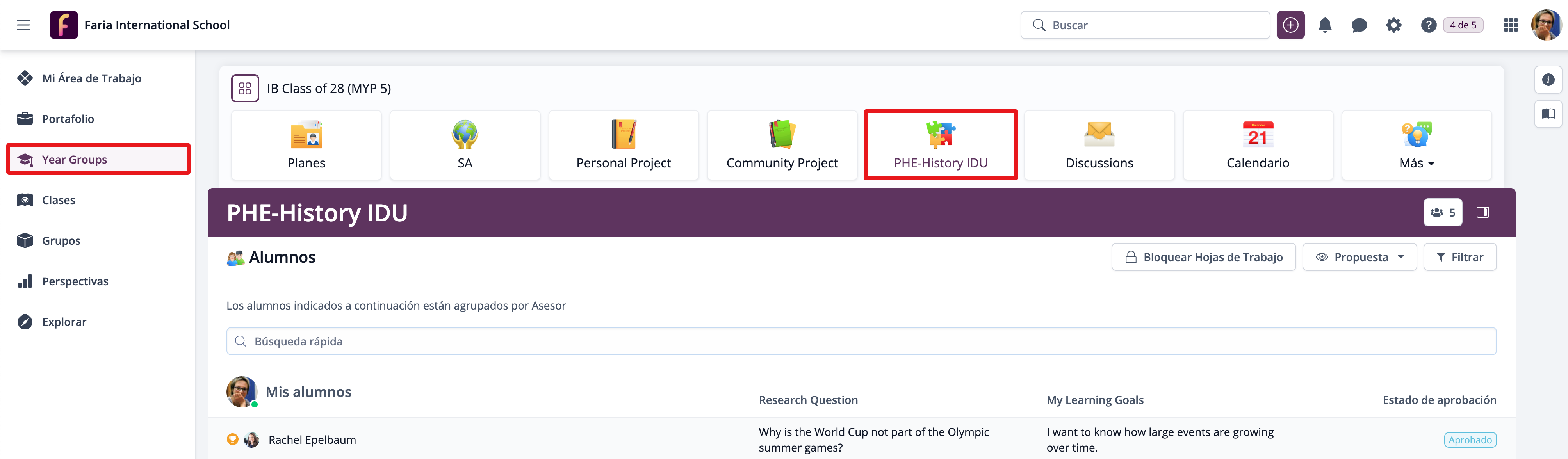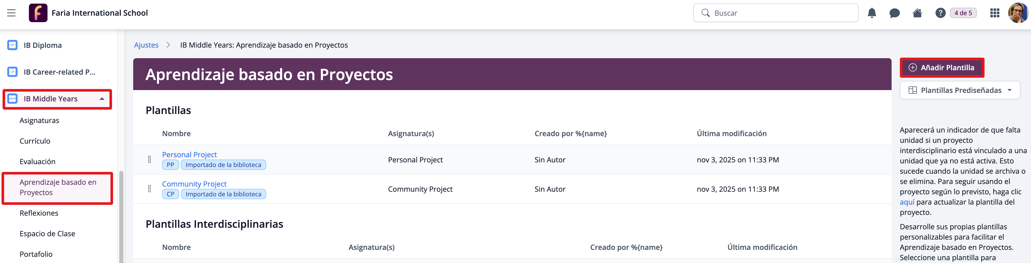 Vía Ajustes > IB Middle Years > Aprendizaje basado en Proyectos