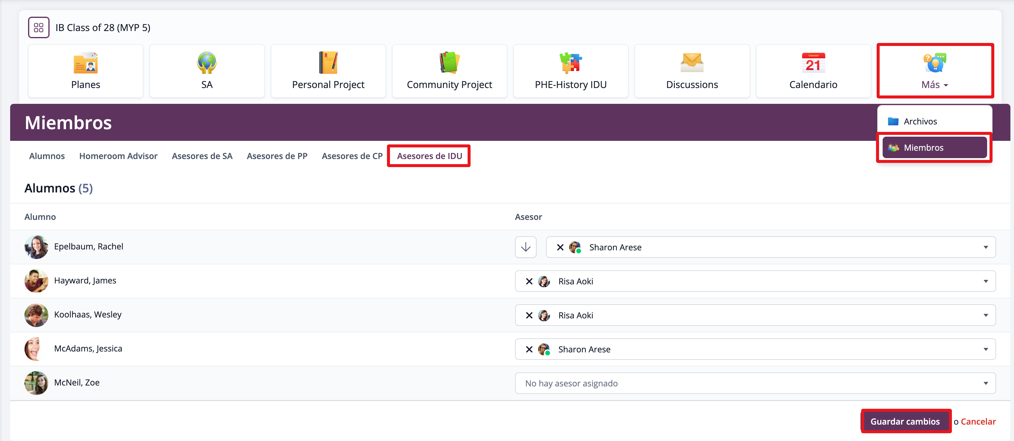 Los asesores del Proyecto Interdisciplinario (ID Project) pueden asignarse en bloque desde Miembros > Asesores de IDU, dentro del Grupo de Año donde esté habilitada la plantilla del Proyecto Interdisciplinario.