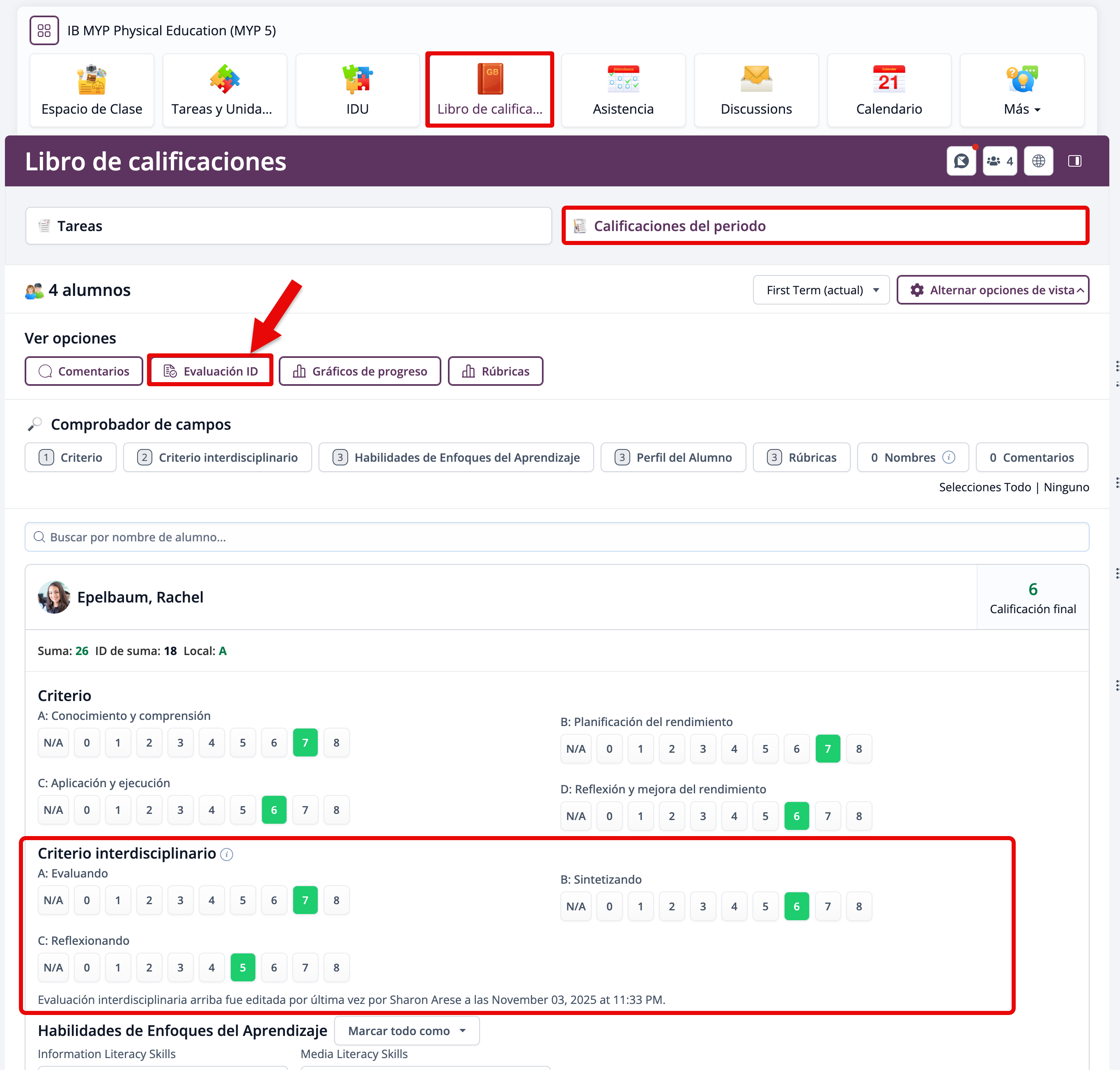 Los criterios interdisciplinarios del MYP también se pueden evaluar mediante el Libro de Calificaciones de la Clase en la pestaña de Calificaciones del período