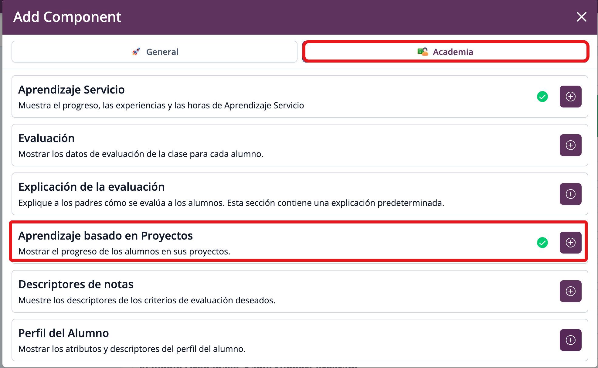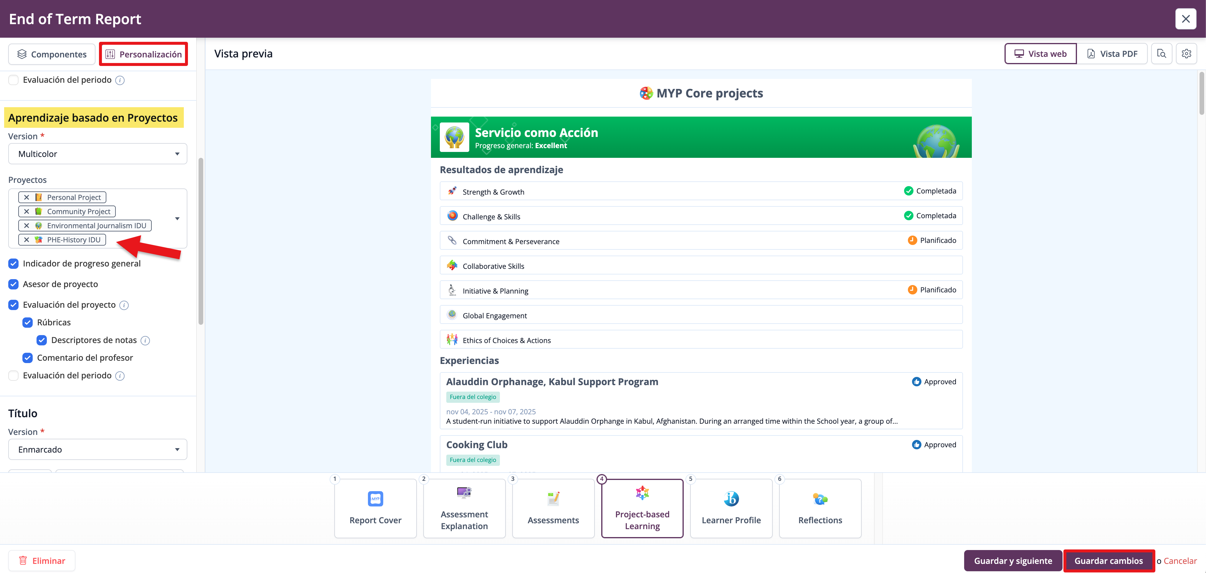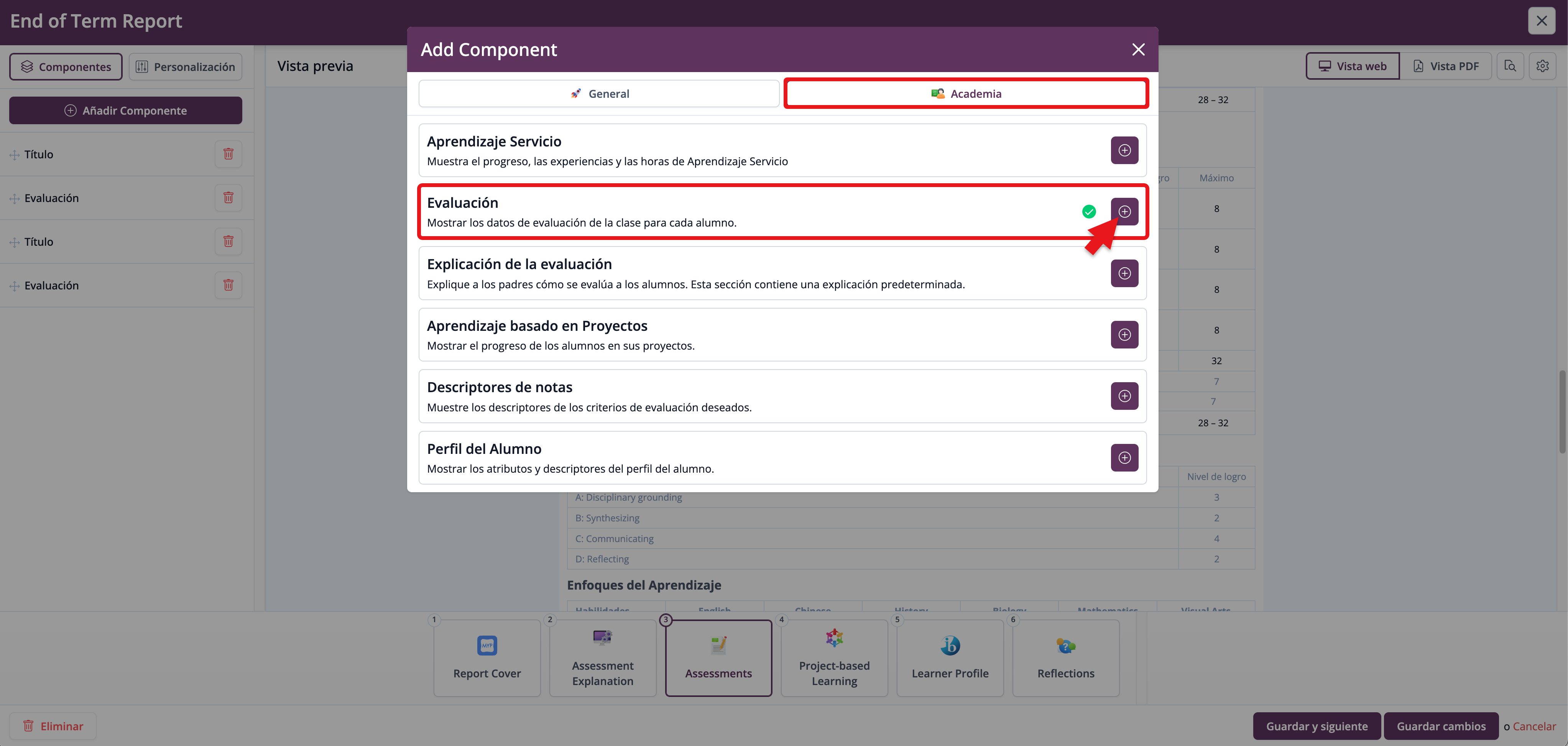 Los datos de Evaluación del Proyecto según los Criterios Interdisciplinarios pueden incluirse en las plantillas de informe a través del componente de Aprendizaje basado en Proyectos. Las plantillas deben tener al menos una sección agregada a una plantilla de informe en vista web para luego agregar el Componente de Aprendizaje Basado en Proyectos a esa sección.