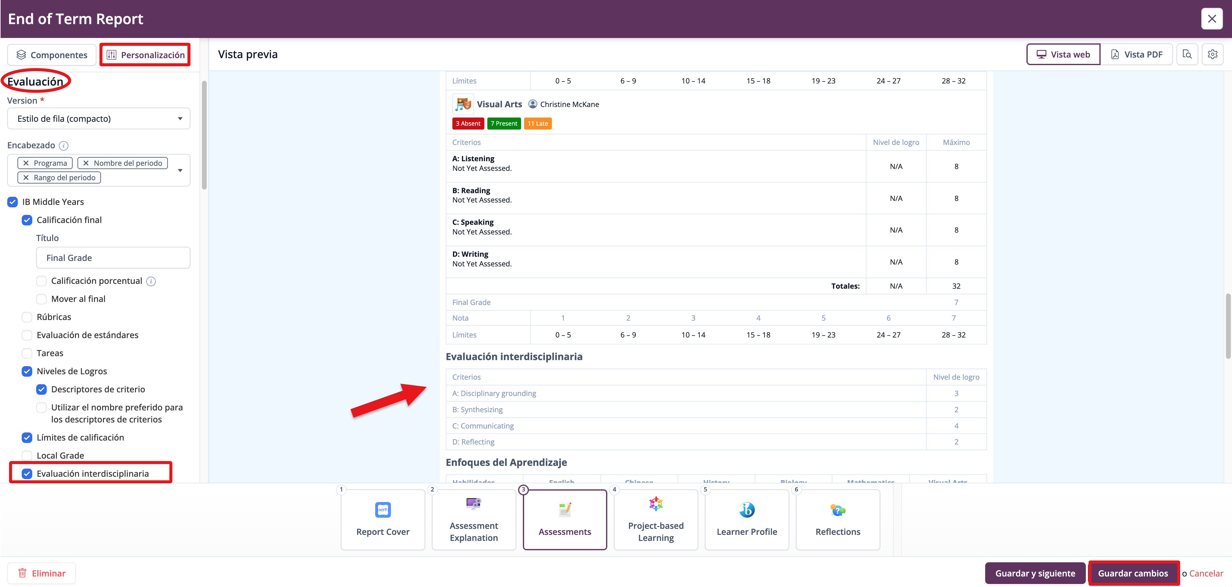 Las calificaciones de los Criterios Interdisciplinarios pueden incluirse en las plantillas de informes del MYP a través del componente Evaluación.