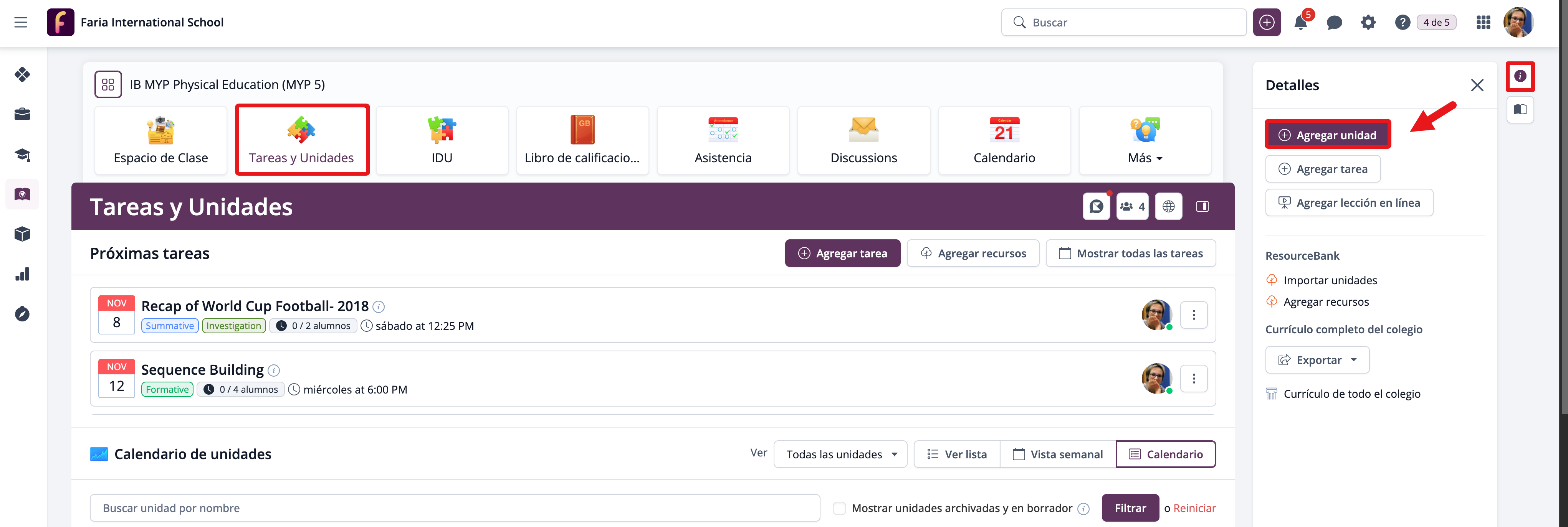 Desde la pestaña Clases, selecciona la clase correspondiente y luego accede a Tareas y Unidades. Para agregar una nueva unidad, haz clic en Agregar unidad.