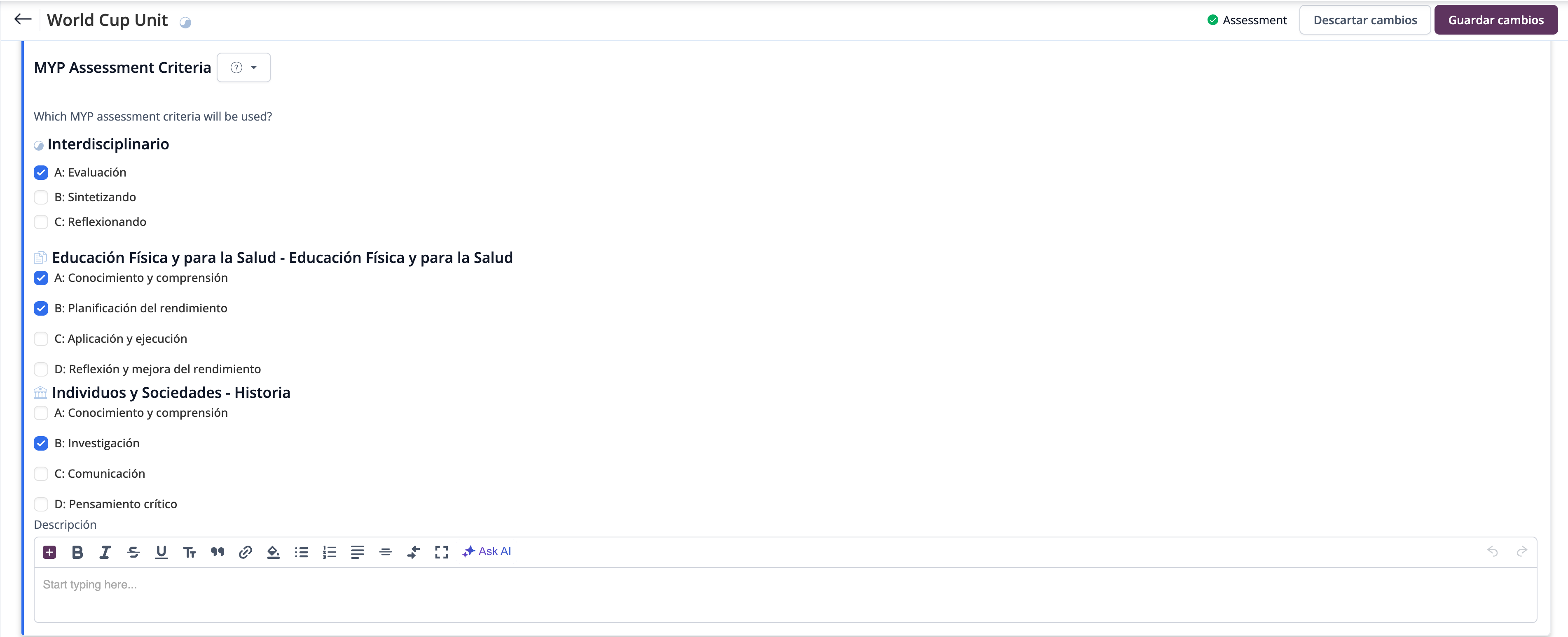 La sección Evaluación (Assessment) también incluirá los Interdisciplinary Assessment Criteria, así como los criterios de las asignaturas vinculadas.